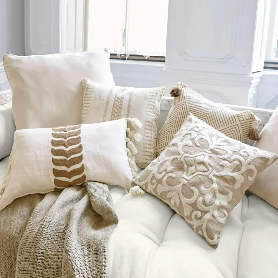 Kein anderer Trend ist so facettenreich wie der Ethno-Stil. Geprägt von traditionellen Mustern fremder Kulturen diente er auch als Inspirationsquelle für dieses edle Kissenhüllen-Set. Vier Bezüge zeigen ein munteres Spiel mit verschiedenen Mustern, welche auf der Vorderseite durch einen hochwertigen Digitaldruck in Szene gesetzt werden. Und das in einer natürlichen, dezenten Farbigkeit, dass das Quartett schon wieder elegant wirkt. Schmuckvolle Details gehören dazu: So sind zwei Hüllen mit verspielten Quasten verziert, eine weitere Hülle ist zusätzlich edel bestickt. Das reine Leinengewebe passt ideal zum Look und sorgt für die angenehm weiche Haptik. Ein praktischer Reißverschluss rundet jedes Textil ab. Schon in Einzelstellung auf dem gemütlichen Loungesessel sprechen die Zierkissen für sich, doch in Kombination auf der Couch entfalten sie eine einzigartige Wirkung.