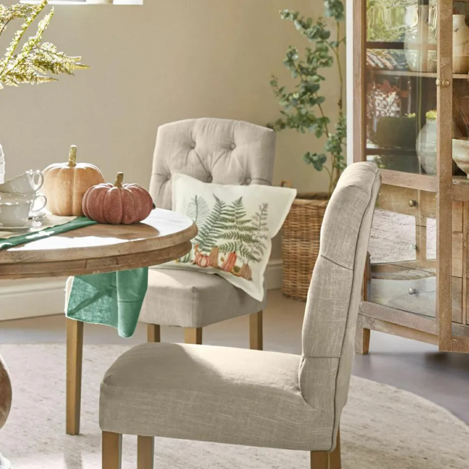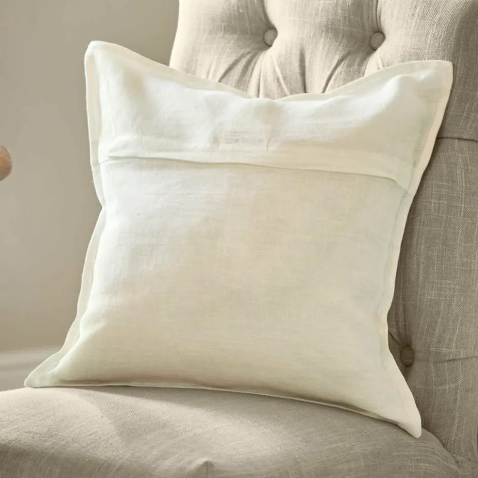 Wenn sich draußen die Blätter färben und die Natur in warmes Gold und zartes Moosgrün getaucht ist, bringt diese Kissenhülle genau dieses Gefühl nach drinnen. Auf feinem, reinem Leinen entfalten sich detailreich gestickte Farnwedel und kleine, stilisierte Kürbisse in einer Farbpalette aus Rostrot, Salbei, Senf und Creme. Die Motive wirken beinahe wie Aquarelle – zart, lebendig und doch dezent. Das naturbelassene Material verleiht dem Ganzen eine wunderbar weiche Textur mit leicht rustikalem Charakter. Ob als saisonales Highlight oder dauerhaftes Lieblingsstück: Dieses Kissen bringt mit kunstvoller Stickerei herbstliche Leichtigkeit auf jedes Sofa.