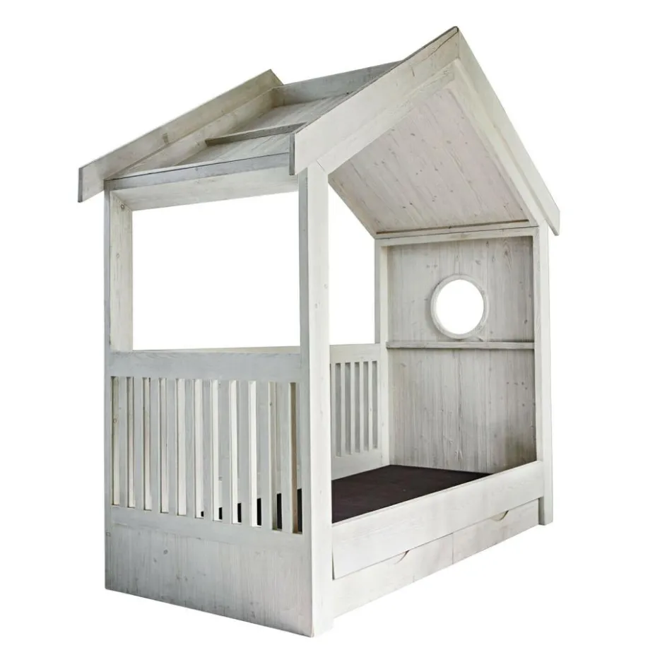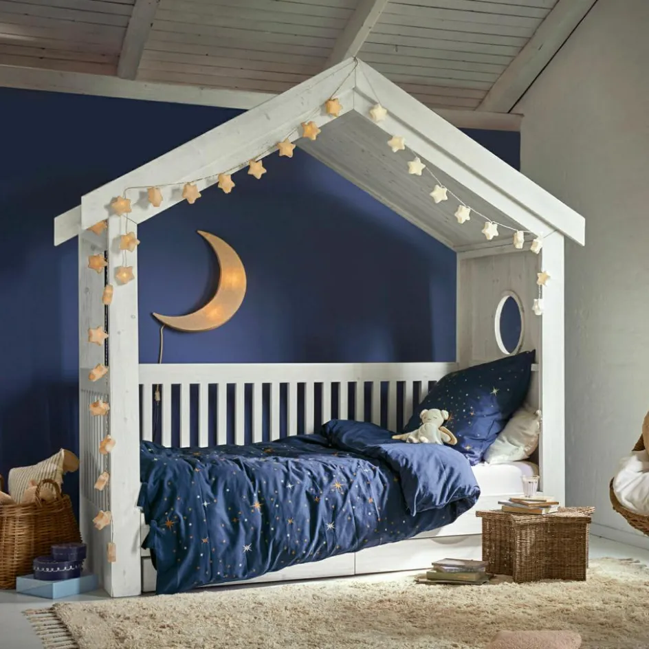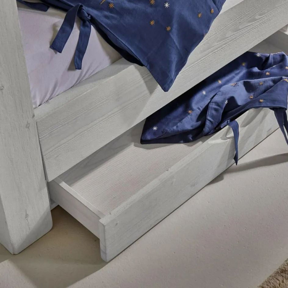 Ein Bett, das mehr ist als nur ein Schlafplatz – dieses Häuschen in Bettform weckt Fantasie, lädt zum Kuscheln ein und bietet zugleich durchdachten Stauraum. Das helle, sanft lackierte Tannenholz zeigt bewusst seine lebendige Maserung und charmante Astaugen – so bleibt die natürliche Schönheit des Materials spürbar erhalten. Die offene Giebelkonstruktion schafft ein Gefühl von Raum und Geborgenheit zugleich, fast wie ein eigenes kleines Zuhause im Zimmer. Besonders praktisch: Unter dem Bett verbergen sich zwei große Schubladen mit formschönen Muldengriffen – perfekt für Bettwäsche, Bücher oder Spielzeug. Die Matratze (nicht im Lieferumfang enthalten) liegt auf einer festen Holzkonstruktion, sodass auch ein Lattenrost nicht benötigt wird. Ein stilvoller Rückzugsort, der Kindern Freiraum lässt und Eltern durchdachtes Design bietet.