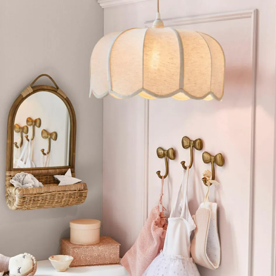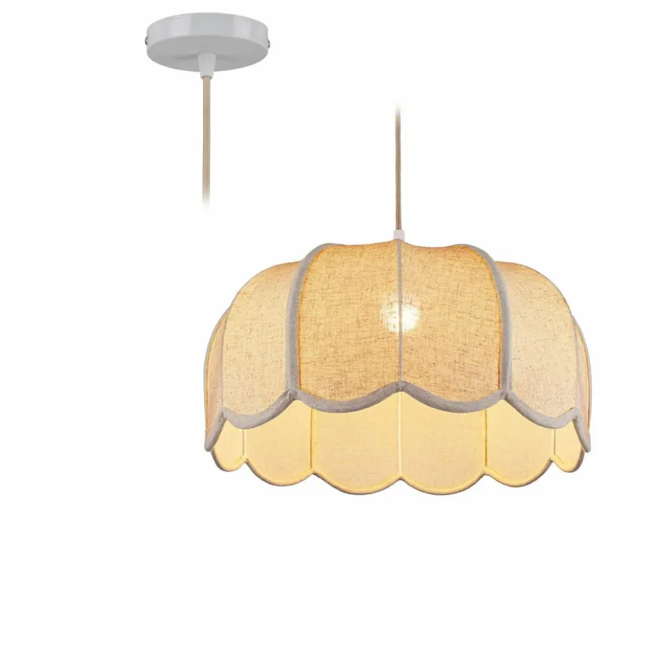 Wie eine Blume, die sich zur Sonne neigt, entfaltet diese Hängelampe ihre charmante Wirkung im Raum. Der weiche Schirm aus naturfarbener Baumwolle ist in liebevoll geschwungene Bahnen gefasst, die an die Silhouette einer geöffneten Blüte erinnern. Besonders bei eingeschaltetem Licht entfaltet sich ihre volle Wirkung: Die Struktur des Stoffes leuchtet sanft auf und verbreitet ein angenehm warmes Licht – perfekt für Kuschelstunden oder Gute-Nacht-Geschichten. Die Form, die ein wenig an Lampenschirme vergangener Zeiten erinnert, verleiht ihr eine nostalgische Note, ohne altmodisch zu wirken. Ideal für Kinderzimmer, aber auch für alle anderen Räume, die eine Prise Leichtigkeit vertragen können.