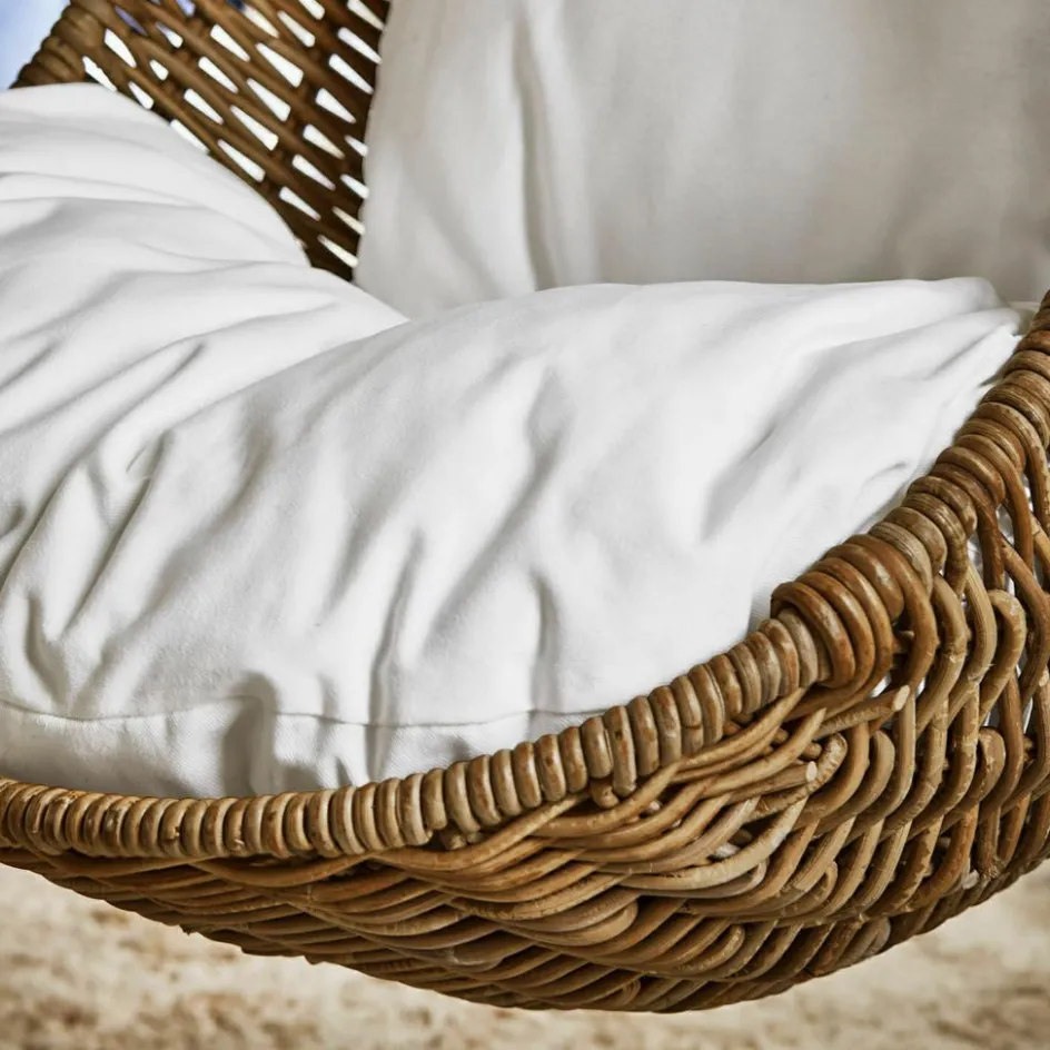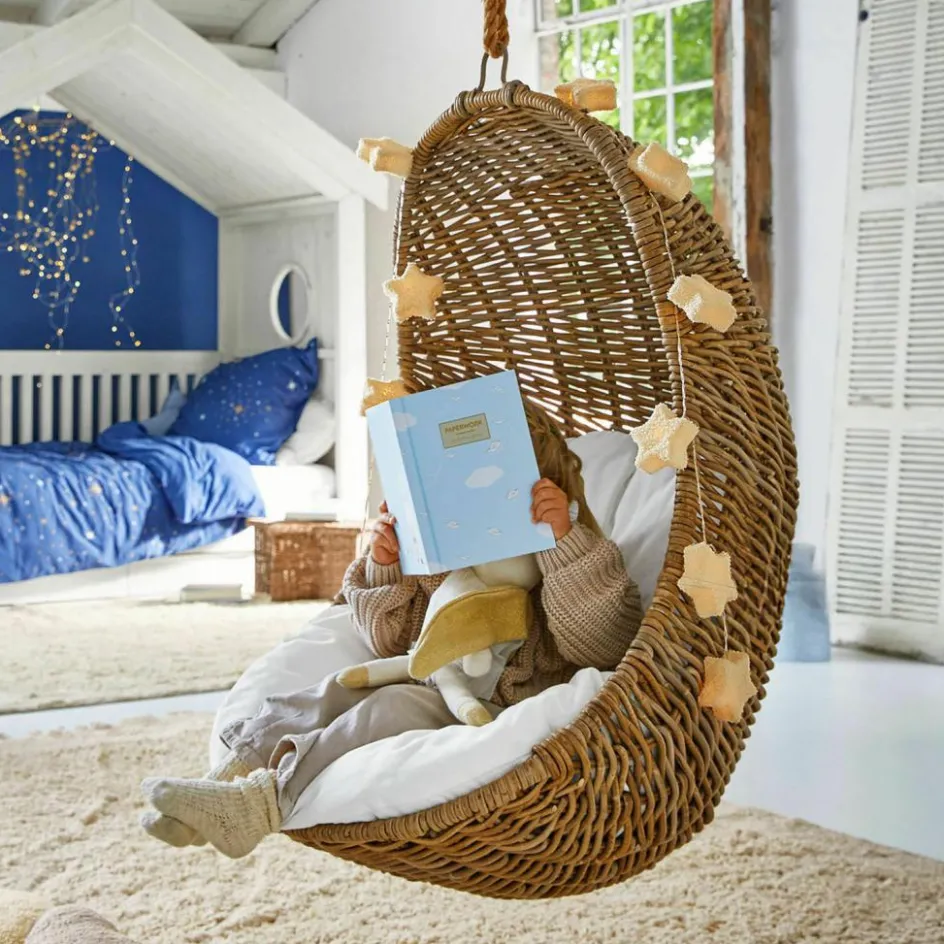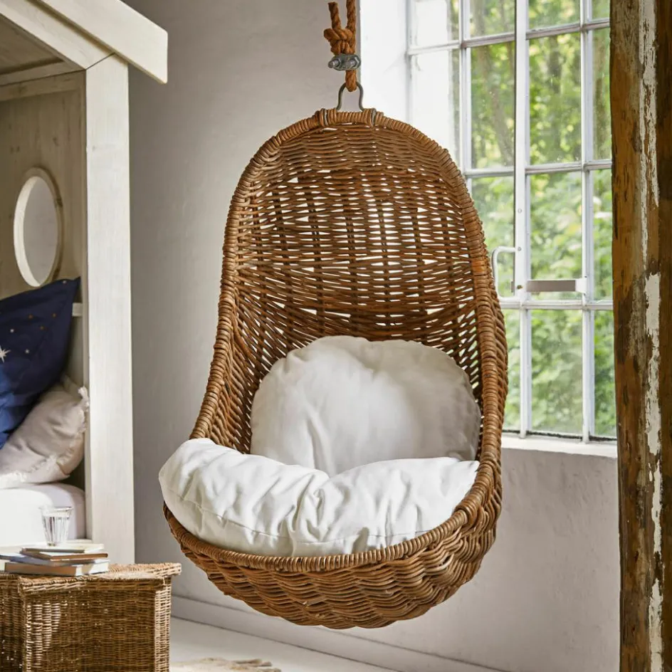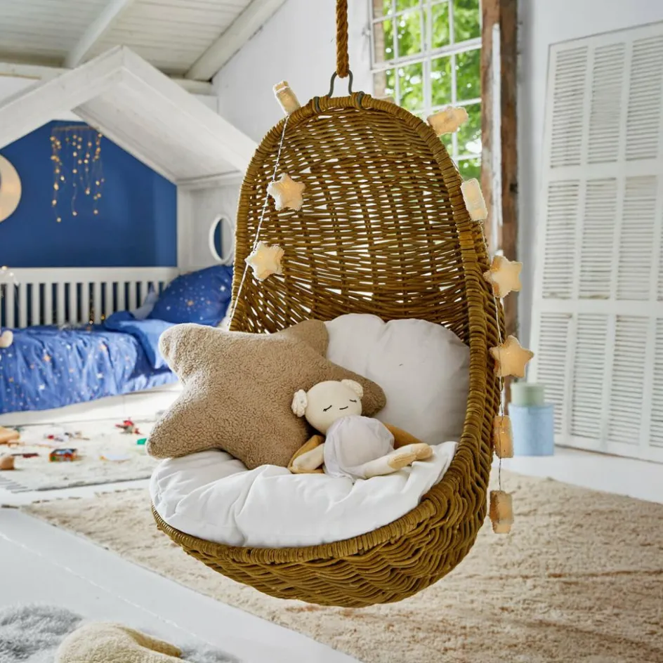 Wie eine kleine Hütte in der Luft lädt dieser Kinderhängesessel zum Kuscheln, Lesen und Träumen ein. Seine organische Form schmiegt sich sanft um den Körper, das handgeflochtene Rattan fühlt sich angenehm an und lässt Licht und Luft hindurchspielen. Im Inneren sorgt ein robustes Eisengestell für sicheren Halt, während ein weiches Polsterkissen zum Verweilen verführt. An einem Juteseil befestigt, wird aus dem Sessel ein schwebender Rückzugsort, der Natürlichkeit und Geborgenheit ausstrahlt. Ideal für kleine Abenteurer, die zwischendurch in ihrer eigenen Wolke ruhen möchten.