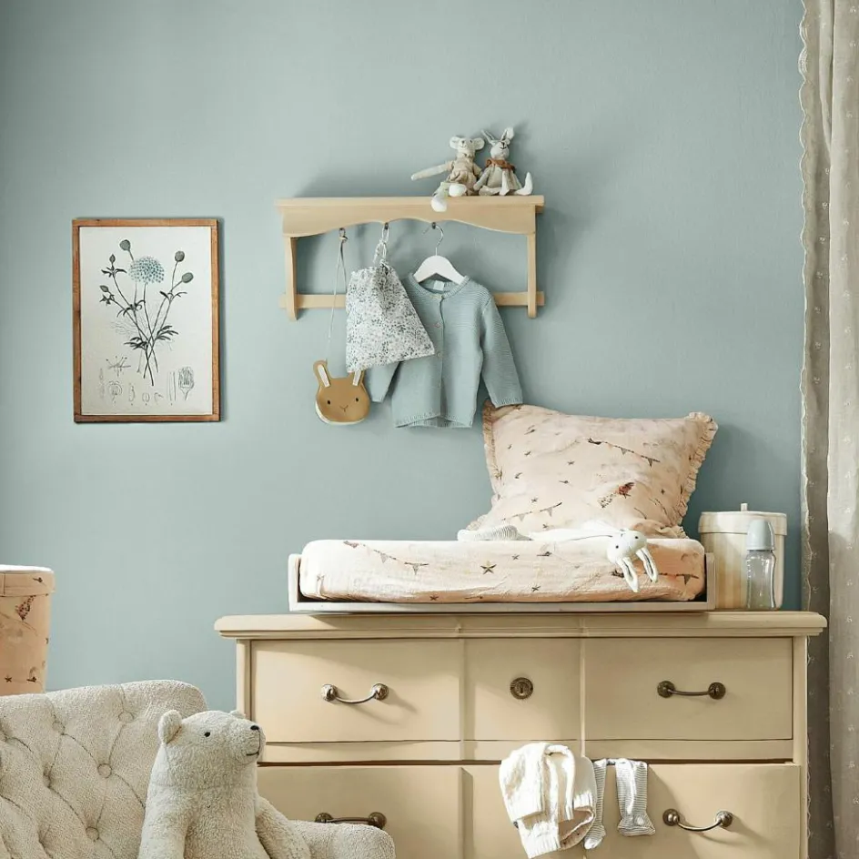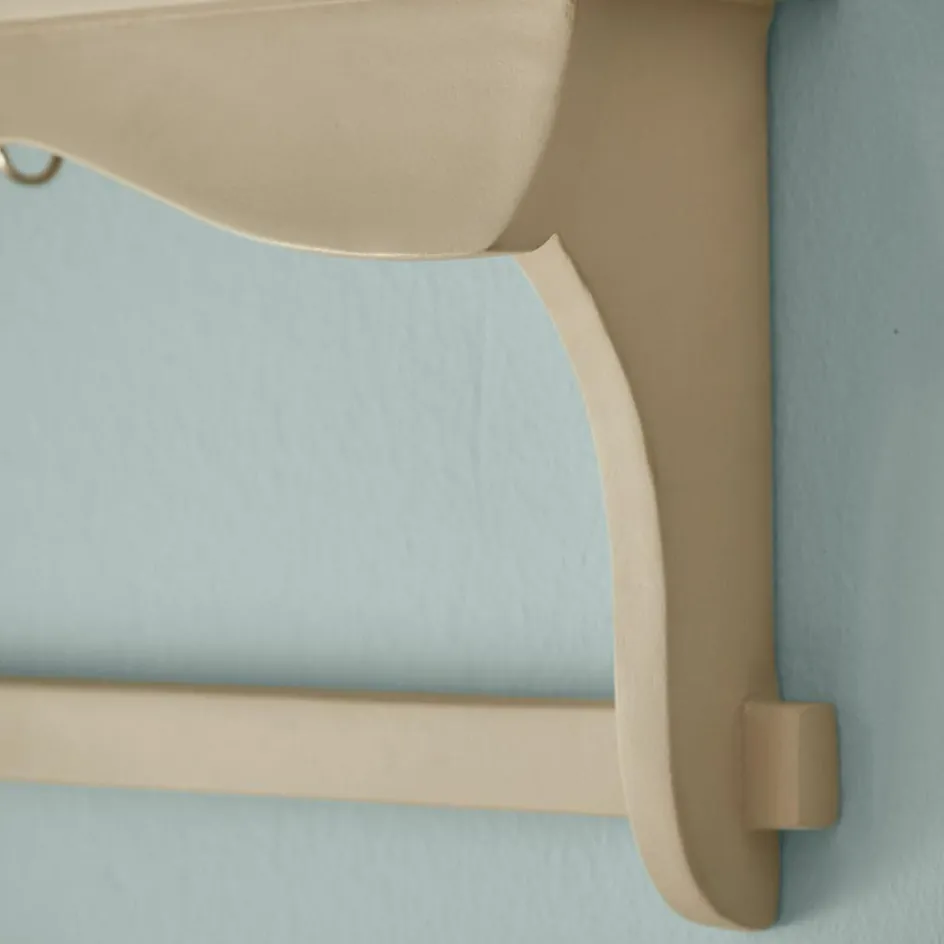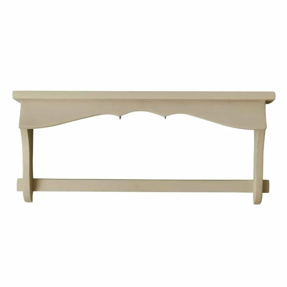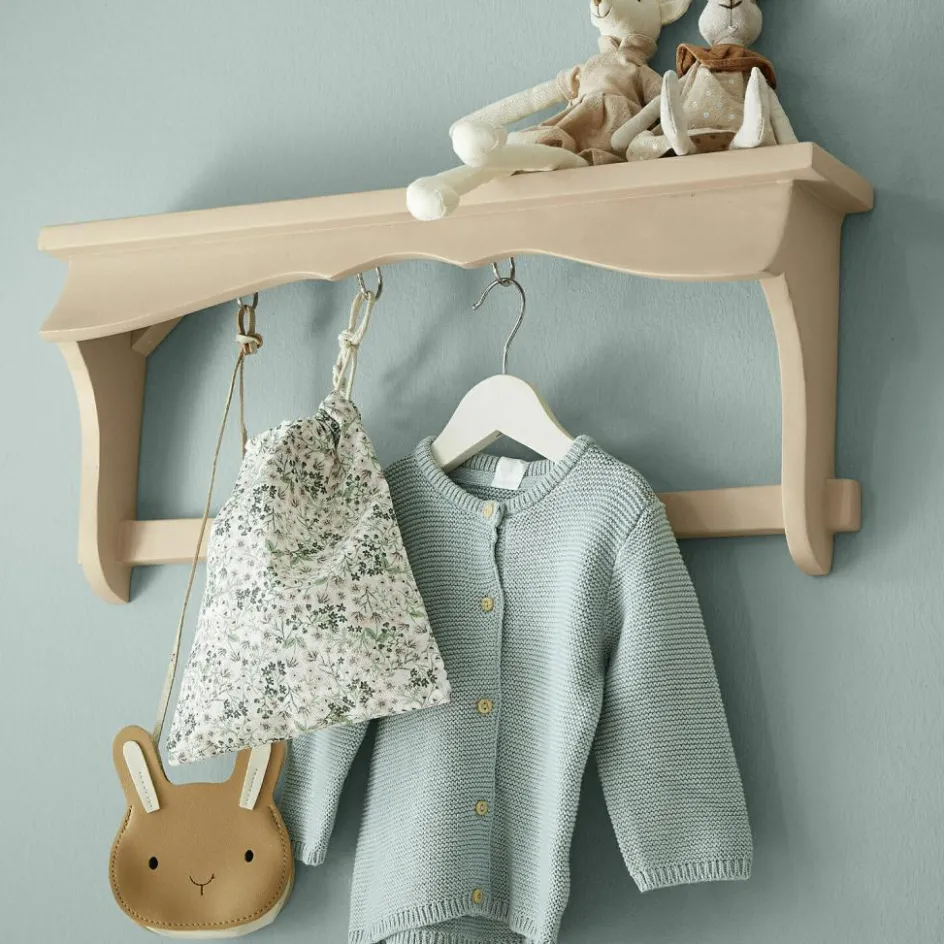 Dieses wunderschöne Wandregal aus hochwertigem, lackiertem Mangoholz verleiht jedem Raum einen Hauch von Eleganz. Die zarte Farbe und die kompakte Größe von nur 60 cm Breite machen es ideal für das Kinderzimmer, wo es nicht nur stilvoll, sondern auch praktisch ist. Die vier robusten Eisenhaken bieten Platz für Jacken, Taschen, Bücher oder andere kleine Accessoires und sorgen für Ordnung. Mit seiner geschwungenen Form und der glatten Haptik ist dieses Regal ein bezauberndes Highlight, das Funktionalität und Ästhetik perfekt kombiniert.