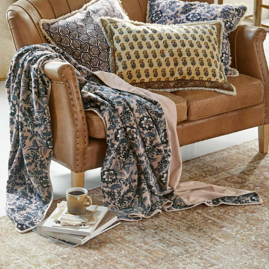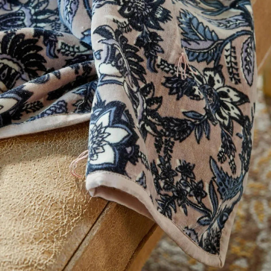 Tauchen Sie ein in den luxuriösen Komfort dieses handgefertigten Plaids aus edlem Baumwollsamt. Jedes Detail, von den kunstvollen Drucken bis hin zu den liebevoll angebrachten losen Fäden, zeugt von höchster Handwerkskunst und einem unvergleichlichen Gespür für Ästhetik. Die Vorderseite ziert ein farbenfrohes, florales Muster, das mit seinen sanften Tönen und feinen Details ein wahrer Blickfang ist. Die Rückseite ist in einer stilvollen Unifarbe gehalten, was dem Plaid eine zeitlose Eleganz verleiht und es vielseitig einsetzbar macht. Egal ob als wärmende Decke auf dem Sofa oder als dekoratives Element im Schlafzimmer – dieses Plaid verbindet Funktionalität mit einem unvergleichlichen Sinn für Stil und Qualität.