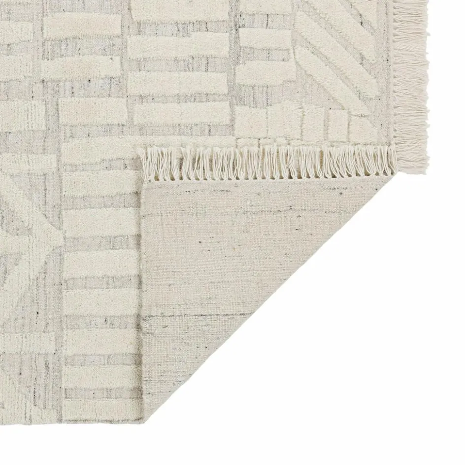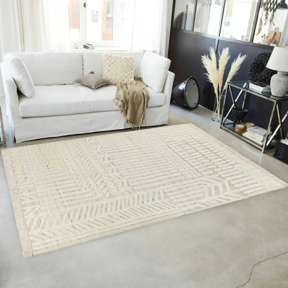 Möbel und Wohntextilien in neutralen Nuancen wirken immer edel und bringen eine angenehme Ruhe in das Ambiente. Auch dieser hochwertige Teppich bietet alles für eine stilvoll dezente Raumgestaltung. Schon allein durch seine zurückhaltende Farbgebung strahlt er eine zeitlose Eleganz aus. Langweilig wirkt er trotzdem nicht. Denn die leichten Hoch-Tief-Strukturen lassen die raffinierten Musterspiele entstehen und machen so den Teppich auch für das Auge attraktiv. Trotz seinem relativ dünnen Gewebe aus Wolle und Baumwolle ist er überraschend weich in der Haptik, dennoch strapazierfähig und langlebig. Abgerundet wird das Erscheinungsbild durch feine Fransen an den Schmalkanten. Ein exquisiter Wohnakzent, der in jedem Interieur eine behagliche Atmosphäre schafft und aus Ihren Lieblingsplätzen einladende Komfort-Zonen macht – ob im Wohnzimmer, im Schlafzimmer oder Gästezimmer.