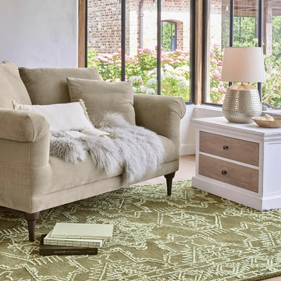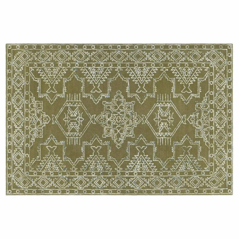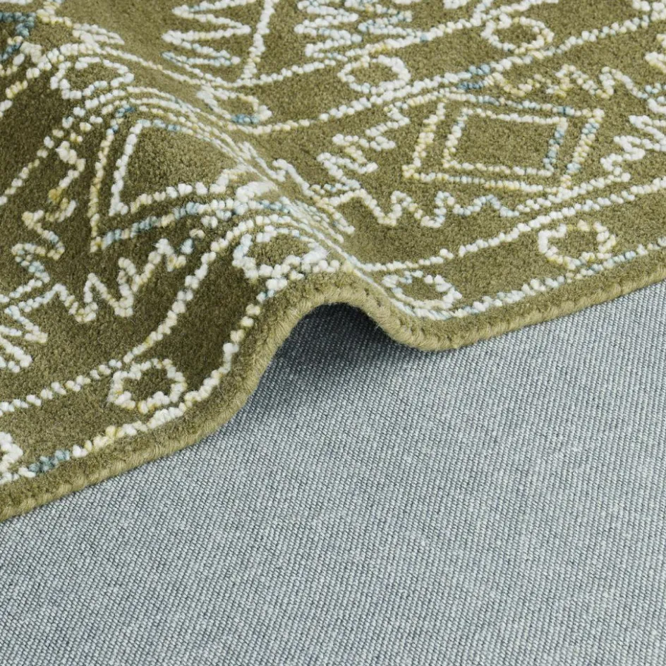 Dieser geknüpfte Teppich ist mehr als nur ein Bodenbelag – er ist ein Statement. In einem satten Olivgrün gehalten, entfaltet sich auf seiner Oberfläche ein detailverliebtes Ethnomuster, das Erinnerungen an ferne Kulturen und kunstvolle Handwerkskunst weckt. Die klare, grafische Linienführung in Cremeweiß bildet dazu einen spannenden Kontrast und verleiht dem Teppich Tiefe und Struktur. Gefertigt aus reiner Wolle fühlt er sich angenehm griffig an und bringt zugleich eine natürliche Wärme in jeden Raum. Die Rückseite aus Baumwolle macht ihn stabil und anschmiegsam zugleich – perfekt für Wohnzimmer, Schlafzimmer oder jeden Ort, der ein wenig mehr Charakter vertragen kann.