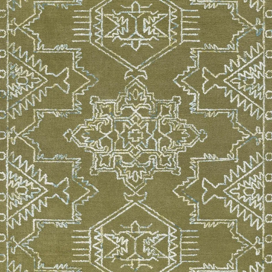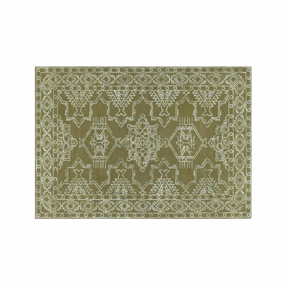 Dieser geknüpfte Teppich ist mehr als nur ein Bodenbelag – er ist ein Statement. In einem satten Olivgrün gehalten, entfaltet sich auf seiner Oberfläche ein detailverliebtes Ethnomuster, das Erinnerungen an ferne Kulturen und kunstvolle Handwerkskunst weckt. Die klare, grafische Linienführung in Cremeweiß bildet dazu einen spannenden Kontrast und verleiht dem Teppich Tiefe und Struktur. Gefertigt aus reiner Wolle fühlt er sich angenehm griffig an und bringt zugleich eine natürliche Wärme in jeden Raum. Die Rückseite aus Baumwolle macht ihn stabil und anschmiegsam zugleich – perfekt für Wohnzimmer, Schlafzimmer oder jeden Ort, der ein wenig mehr Charakter vertragen kann.