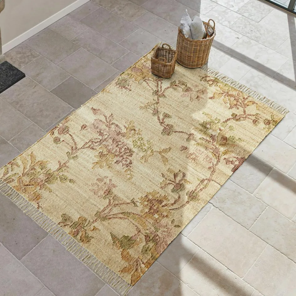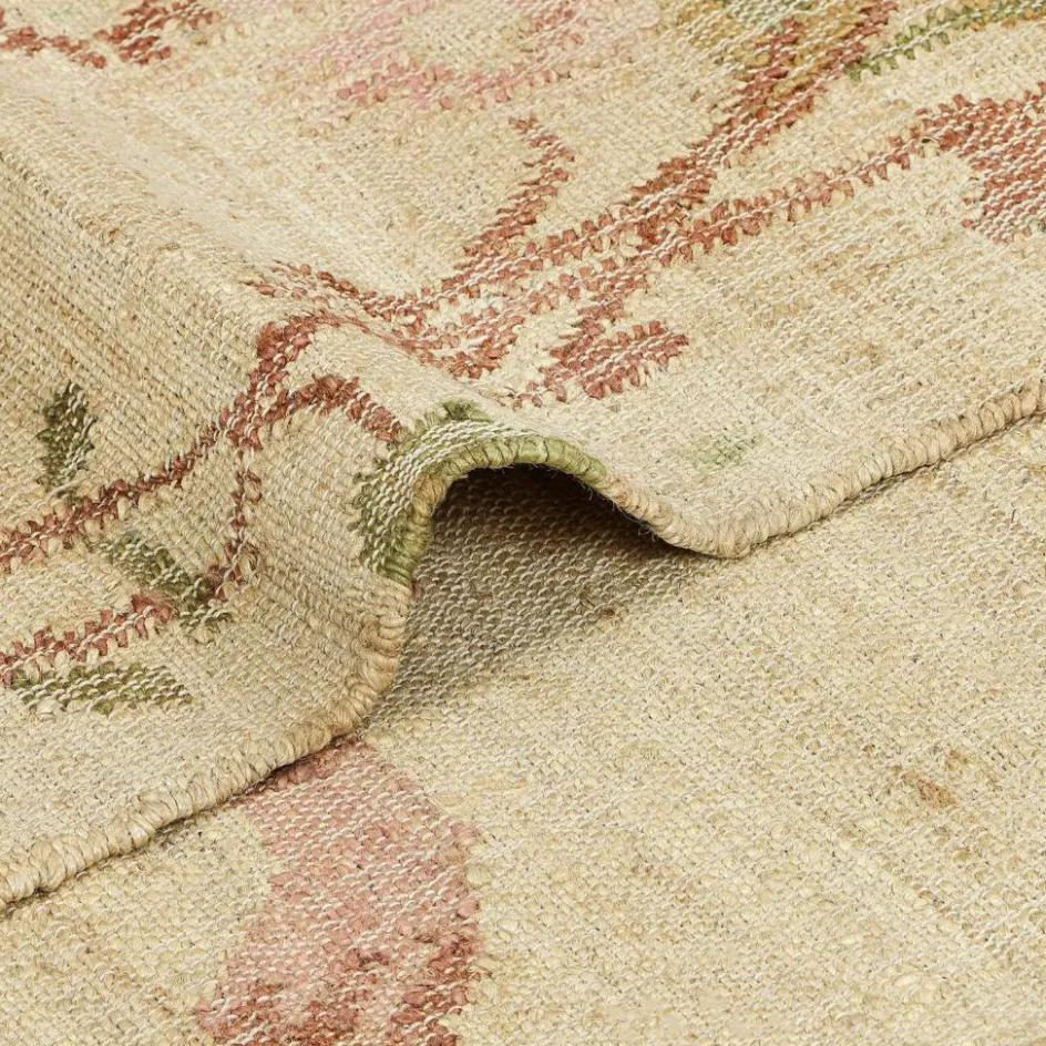 Mit diesem Teppich legen wir Ihnen ein wunderschönes Stück Natur zu Füßen. Wie bei einem impressionistischen Blumen-Stillleben ließ der Künstler eine feinsinnige Komposition aus zierlichen Ranken und Blüten entstehen – aber nicht mit dem Pinsel auf Leinwand, sondern mit den Naturfasern Baumwolle und Jute am Handwebstuhl. Deshalb verwöhnt der flach gewebte Teppich nicht nur mit einem verträumten Blumen-Motiv, sondern lädt Sie auch zum unbeschwerten Betreten ein. Denn während Baumwolle den wohnlichen Aspekt mitbringt, verleiht die Naturfaser Jute dem Teppich die ausgezeichnete Strapazierfähigkeit. Außerdem wirkt der Baumwolle-Jute-Mix klimaregulierend und ist enorm trittelastisch. Dank der sanften Pastellfarben – Blüten ranken sich in Rosa, Gelb und Grün über einen cremefarbenen Fond – verbreitet der Teppich Ruhe im Raum und lässt sich zu vielen Wohnstilen kombinieren. Und last but not least handelt es sich bei Baumwolle und Jute um nachwachsende Rohstoffe, sodass der Teppich außerdem nachhaltig und ökologisch wertvoll ist.