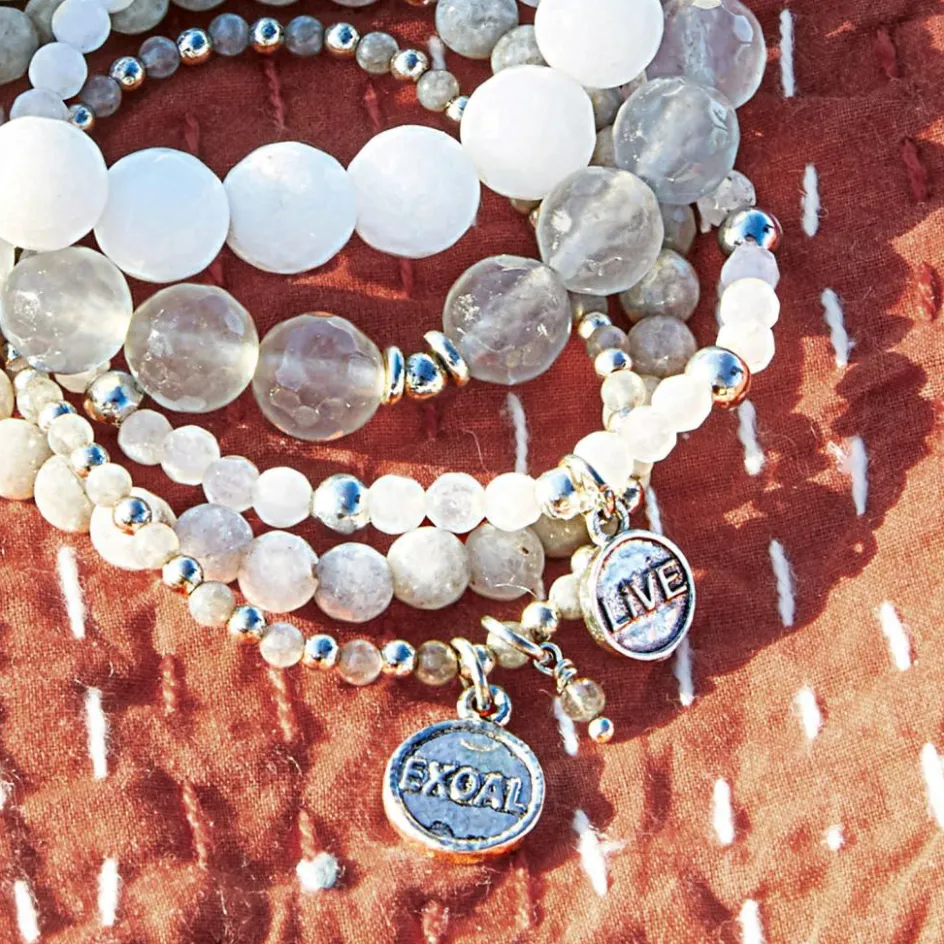Edler Schmuck mit stilvollem, leichten Design. Das elegante Quintett besteht aus edlen Jade-Steinen. Sie können die fünf schönen Armbänder einzeln oder als opulentes Set tragen – hier können Sie beim Styling kreativ werden. Dazu gehören hübsche Anhänger mit Aufschrift aus nickelfreiem Messing. Die runden Jade-Steine liegen angenehm kühlend auf der Haut auf. Kombinieren Sie das attraktive Armband mit dem neuen Sommerkleid oder Jeans und sehen Sie beim City-Bummel, zum Eis essen mit Freunden, beim Klassik Open Air oder bei einem romantischen Dinner einfach toll aus. Zu jedem Outfit gelingt hiermit ein gekonnter und modebewusster Akzent. Das feine Set ist auch eine schöne Geschenkidee für liebe Menschen.