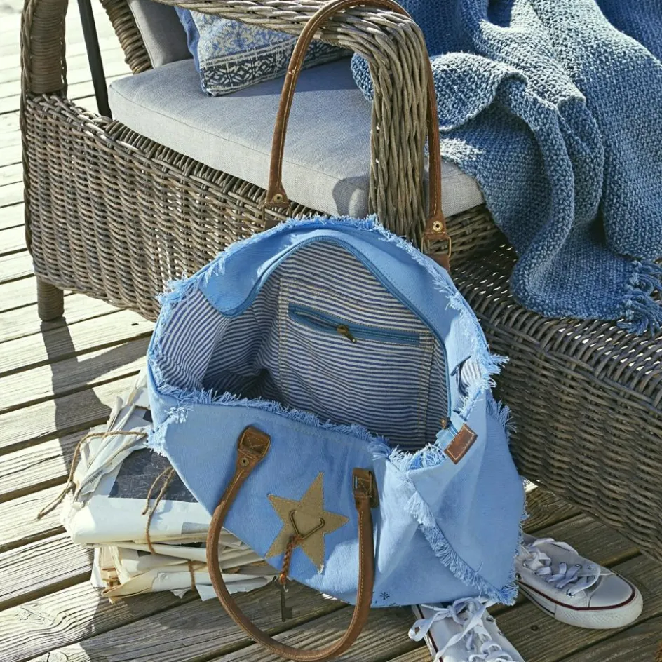 Kreativ und pfiffig präsentiert sich diese charmante Tasche aus robust gewebtem Baumwoll-Canvas. Ein aufgenähter Stern mit Zierschlüsselanhänger sitzt direkt über einem Vintage-Print französischen Ursprungs. Wunderschöne Fransen runden das Gesamtbild auf attraktive Weise ab. Einen hübschen Kontrast stellen nicht nur die Henkel aus weichem Naturleder dar, sondern auch das gestreifte Innenfutter.