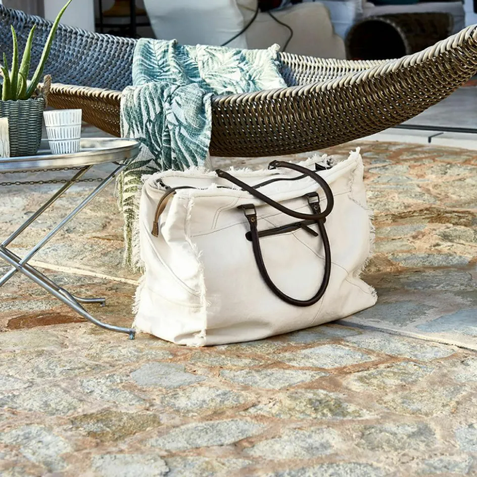 Diese modische Tasche ist wirklich der beste Begleiter für sommerliche Tage. Sie ist großzügig gestaltet und passt zu vielen Outfits, von Jeans bis Sommerkleid. Das helle Gewebe aus reiner Baumwolle ziert ein interessanter Vintage-Print. Die Henkel bestehen aus hochwertigem Büffelleder – ein reizvoller natürlicher Material-Mix. Das hübsche und dekorative Sternchen auf der Vorderseite bezaubert mit süßen Zier-Schlüsselchen. Die Kanten sind raffiniert ausgefranst, was den Look besonders lässig und casual macht. Das Innenfutter ist blau-weiß gestreift, eine kleine Innentasche bietet Raum für das Handy. Diese schicke Tasche ist sehr gut für den Stadtbummel oder einen Tag am See geeignet.