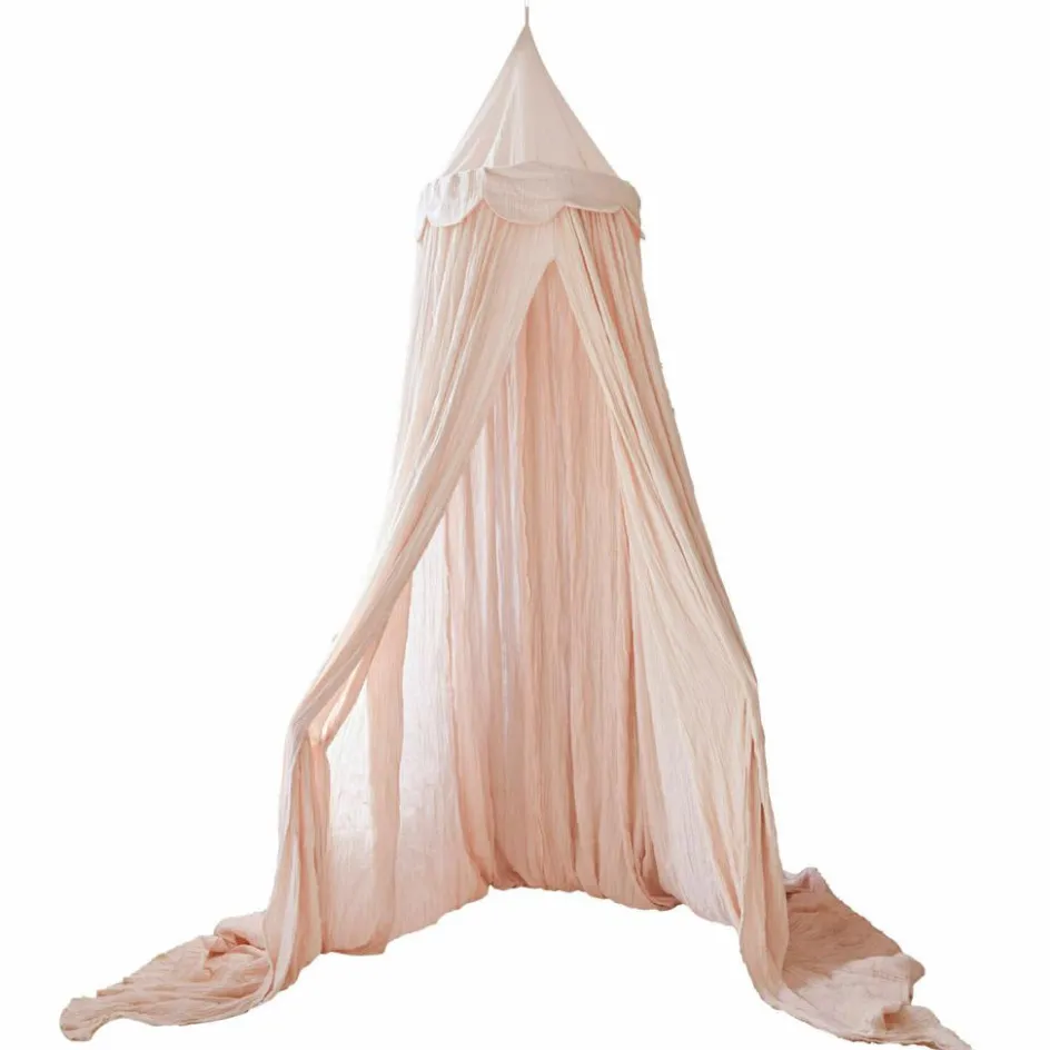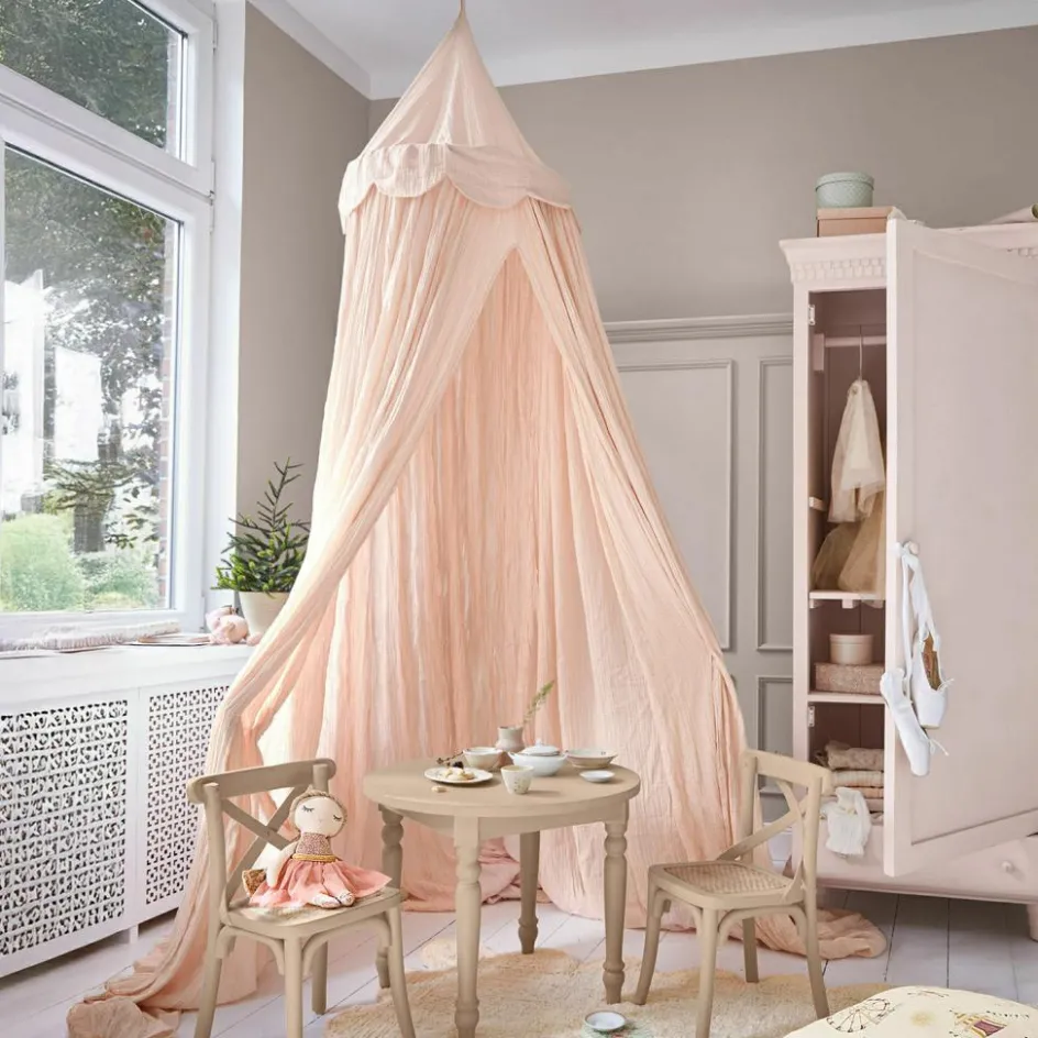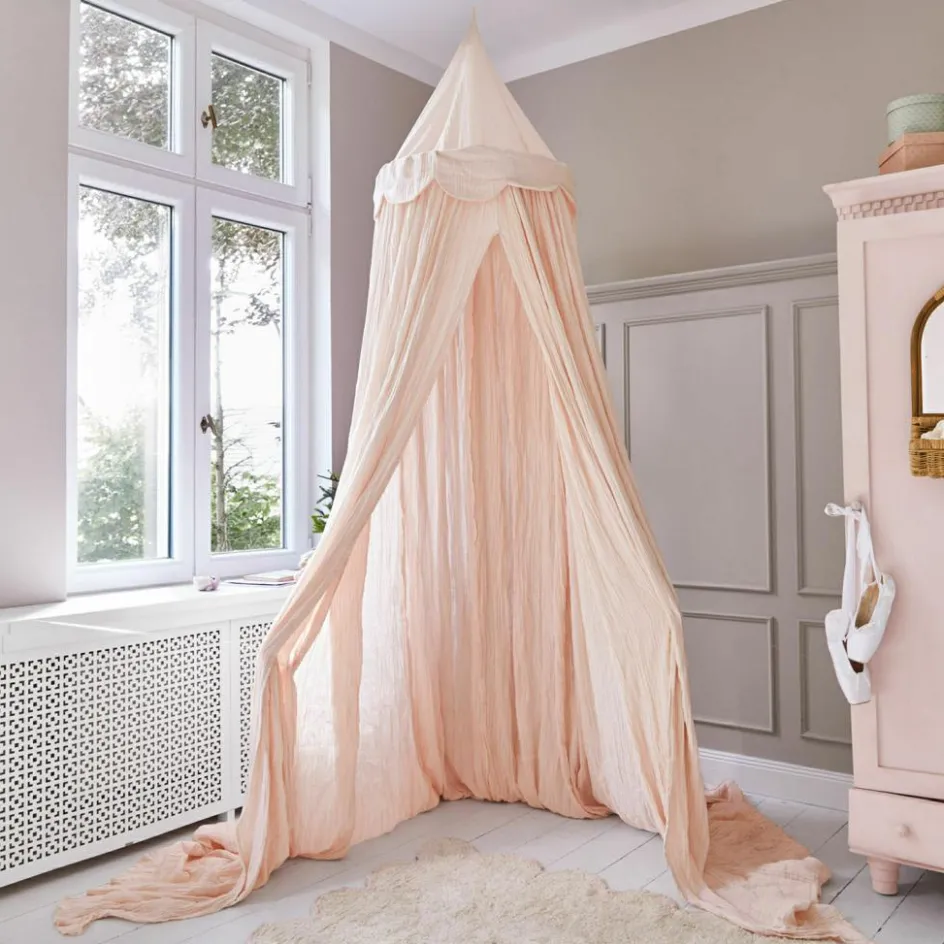 Manchmal braucht es nur ein Stück Stoff, um aus einem Raum eine kleine Welt voller Fantasie zu machen – genau das gelingt diesem Betthimmel aus herrlich weichem Musselin. Der fließende, strukturierte Stoff schirmt sanft ab, ohne zu beschweren, und zaubert ein Gefühl von Sicherheit und Ruhe. Besonders liebevoll gestaltet ist die obere Partie mit ihrer hübsch geschwungenen Wellenkante, die an Märchenzelte oder Zuckerwattewolken erinnert. Ob über dem Babybett, einem kleinen Kuschelnest oder einer Spielecke – dieser Himmel schafft einen Ort, an dem Kinderträume wahr werden.