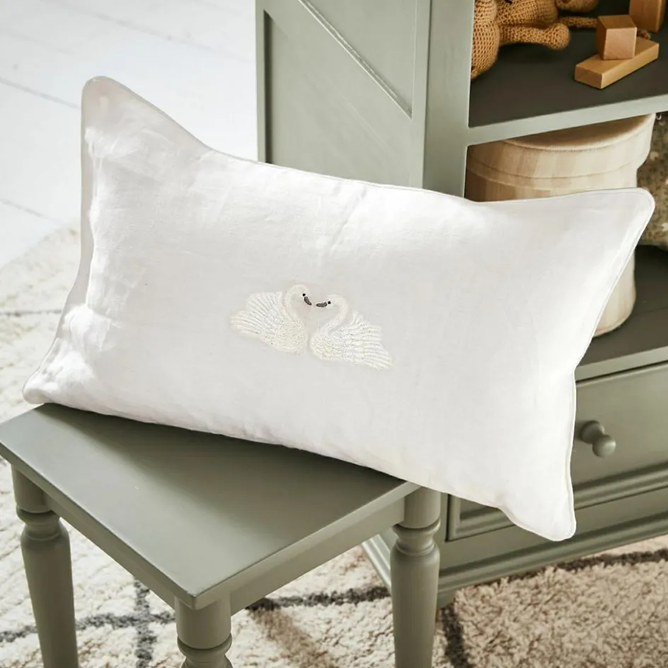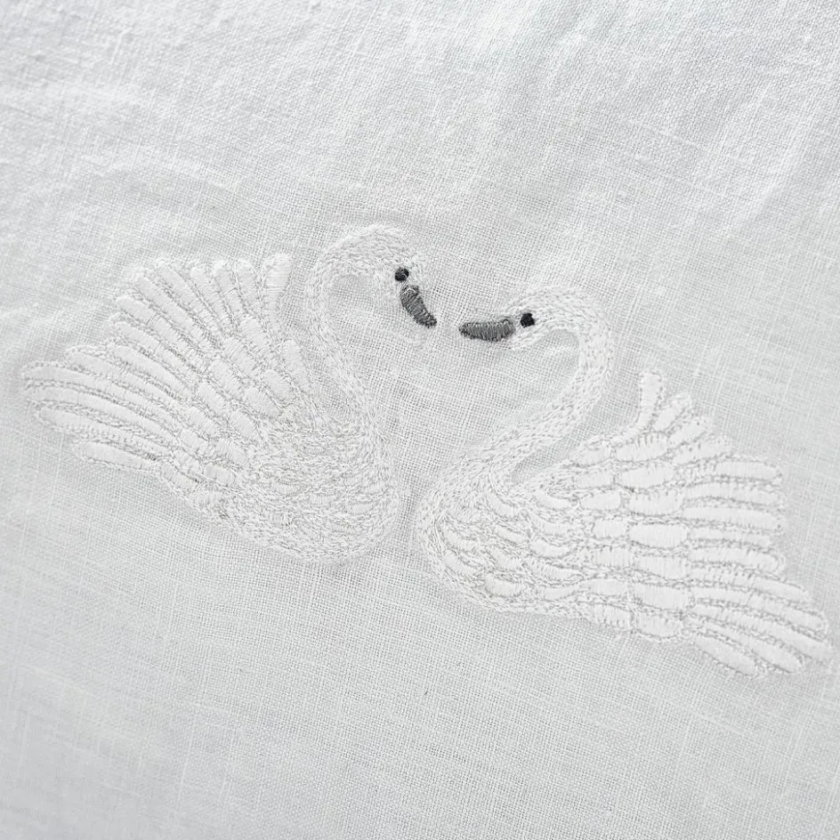 Wie ein leiser Gruß aus einer friedlichen Traumwelt wirkt diese Kissenhülle aus reinem Leinen. Ihre Oberfläche zeigt die typische, leicht unregelmäßige Struktur des Naturmaterials – lebendig, angenehm griffig und voller Charakter. In der Mitte treffen sich zwei anmutige Schwäne, die in feinem Stickgarn ausgearbeitet sind und eine Szene der stillen Zärtlichkeit bilden. Die sanfte Paspelierung entlang der Kanten verleiht dem Design eine klare Form und sorgt für ein liebevoll abgeschlossenes Gesamtbild. Ob im Kinderzimmer, auf dem Lieblingssessel oder als charmantes Detail auf dem Sofa – diese Hülle verleiht jedem Raum einen Hauch stiller Poesie.