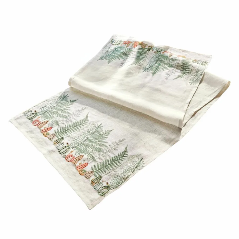 Ein Tischläufer, der Geschichten von herbstlichen Spaziergängen erzählt – mit jedem Blatt, jedem Kürbis, das kunstvoll gedruckt und mit feinen Stickereien betont wurde. Das Motiv aus sanften Farnen und bunt schattierten Kürbissen wirkt wie eine Szene aus einem botanischen Skizzenbuch. Besonders charmant: Die Kombination aus zartem Print und plastischer Bestickung bringt Leben auf jede Tafel. Gefertigt aus reinem Leinen, versprüht das Textil eine ländliche Gelassenheit und passt gleichermaßen zu rustikalen wie modernen Tischgedecken. Ideal für den Herbst – und für alle, die sich an liebevollen Details erfreuen.