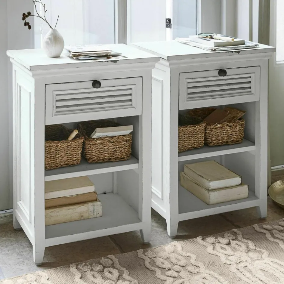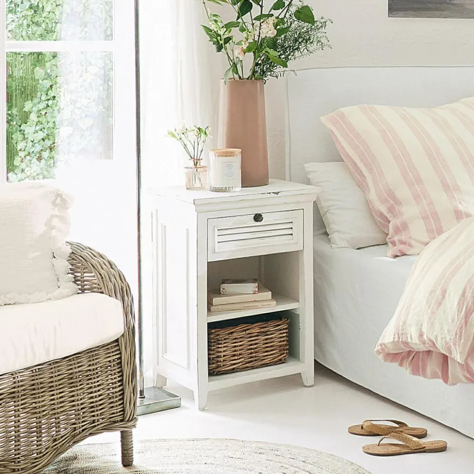 Lust auf ein bisschen Long-Island-Feeling in Ihrem Schlafraum? Mit viel Weiß, mit Naturmaterialien wie Rattan und Wohntextilien in Naturtönen können Sie im Nu sommerlich maritimes Flair entstehen lassen. Dann werden Sie sich fühlen, als würden Sie sich in einem der großen, weißen Holzhäuser auf den Hamptons zum Schlafen legen, während das entfernte Rauschen des Ozeans Sie in den Schlaf wiegt. Achten Sie beim Einrichten aber auch bei den kleineren Möbeln auf den richtigen Look. Dieser Nachttisch im 2er Set versprüht das Flair von Frische und lässiger Leichtigkeit, setzt aber zugleich auf traditionelle Werte wie edle Materialien und hochwertige Verarbeitung. Edel ist das Mangoholz ohne Frage, als Nebenprodukt des Obstanbaus ist es aber außerdem nachhaltig. In puncto Verarbeitungsdetails hat der Möbelschreiner mit diesem Nachttisch ein kleines Meisterwerk geliefert. Von der typischen Kranzleiste über die Kassettenverzierungen an den Seiten bis zu den Lamellen an der Schublade verkörpert der Nachttisch stimmig den zeitlos schönen Long-Island-Stil, während er auf der Platte, in den Schubladen und in den beiden offenen Regalfächern praktische Ablagefläche bietet. Das dezente Antik-Finish macht den authentischen Look perfekt.