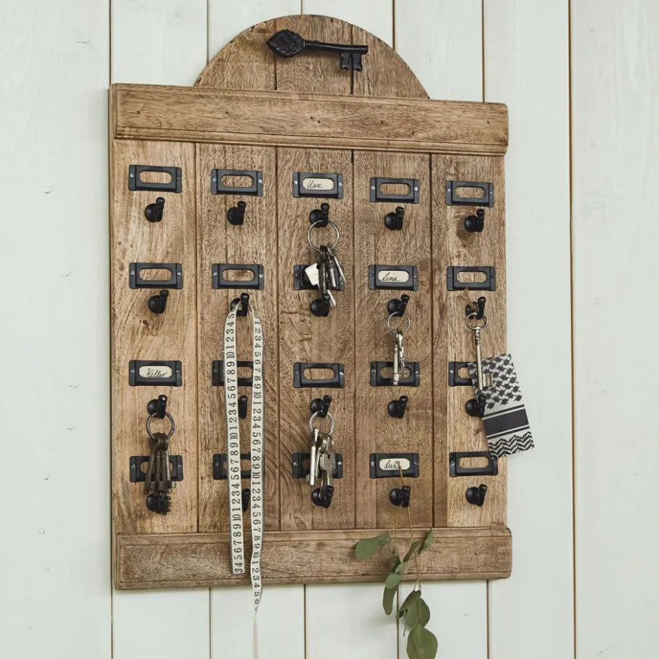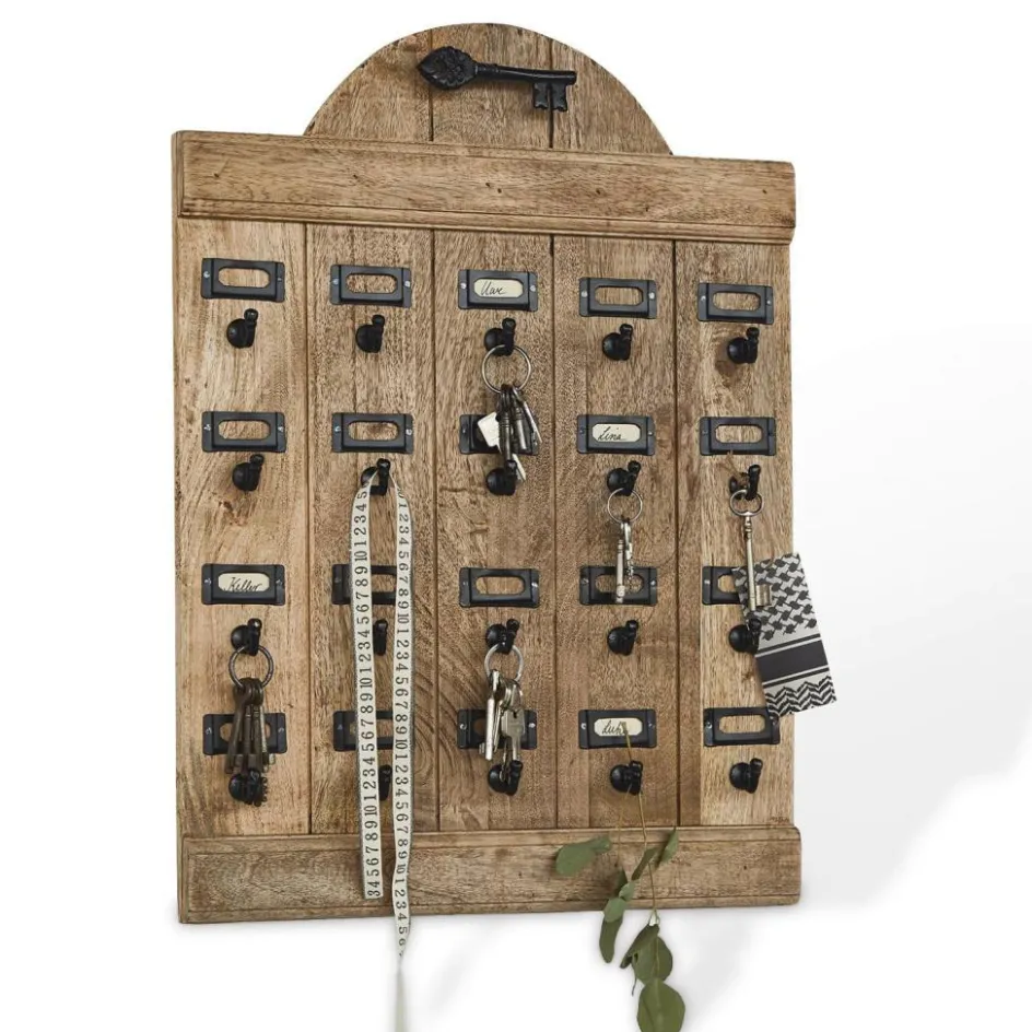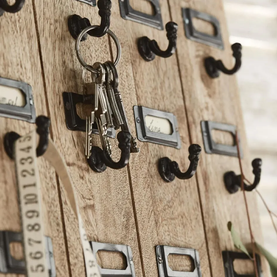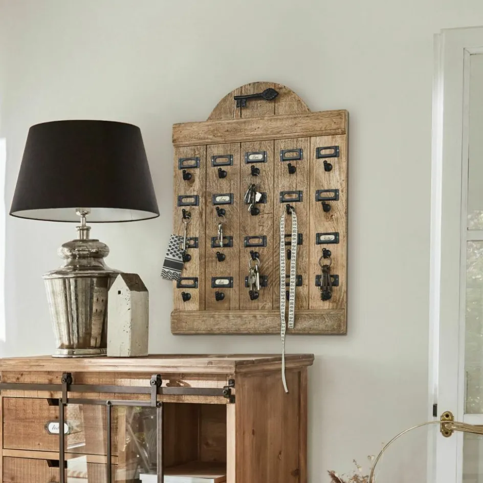 Für die Herstellung dieses außergewöhnlich hübschen Schlüsselboards wurde ausschließlich Mangoholz gewählt, da es eine besonders attraktive Maserung aufweist. Die feine Struktur des hochwertigen Naturmaterials kommt durch ein dezentes Antik-Finish perfekt zur Geltung und passt hervorragend zum natürlichen Charakter des Landhaus-Stils. Man könnte wirklich meinen, dass dieses Stück mehrere Jahrzehnte überdauert hat. Das liegt natürlich auch an den charmanten Schilderhaltern und Schlüsselhaken, die aus antik patiniertem Eisen gefertigt wurden. Die Haken lassen sich also ganz einfach kennzeichnen und Schlüssel und Utensilien griffbereit verwahren. Der ausgeprägte Landhaus-Charakter harmoniert nicht nur mit Vintage-Interieurs, sondern auch mit Wohnkonzepten unterschiedlichster Art.