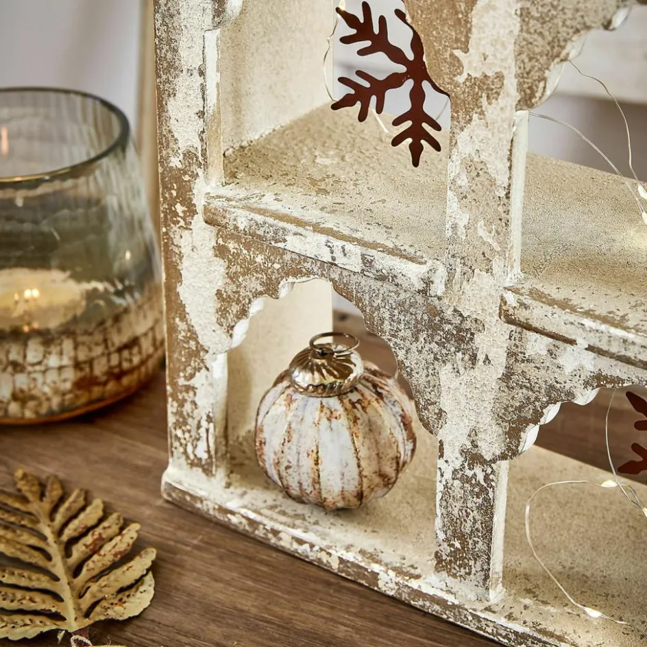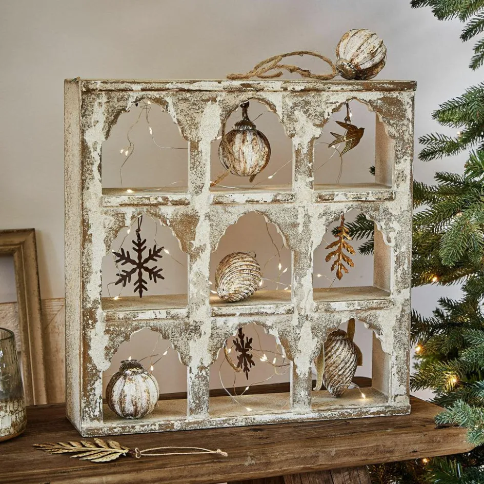 Dieser Wandorganizer vereint nostalgischen Charme mit praktischer Funktionalität. Das Holz mit Antikweiß-Finish verleiht dem Stück eine rustikale Eleganz, die jeden Raum aufwertet. Die sorgfältig gestalteten „Fenster“ mit den schönen Rundbogen-Öffnungen erinnern an historische Architekturen und bieten mit ihren integrierten Haken vielfältige Möglichkeiten, um Ihre Lieblingsstücke dekorativ zu präsentieren. Ob in der Diele für Schlüssel und Accessoires oder im Schlafzimmer für Schmuck – dieser Organizer schafft nicht nur Ordnung, sondern setzt auch stilvolle Akzente. Die sanft abgenutzte Oberfläche und die detaillierte Verarbeitung lassen ihn wie ein antikes Fundstück wirken, das Geschichten von vergangenen Zeiten erzählt.