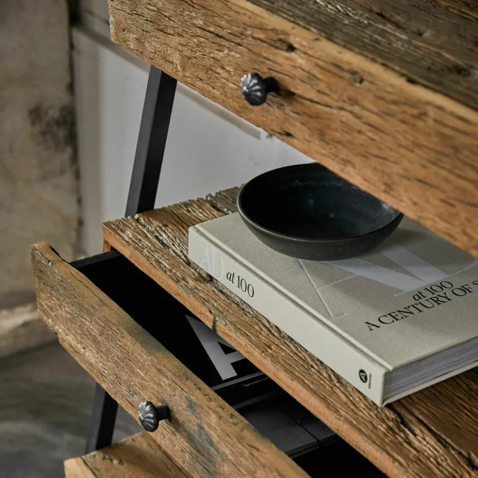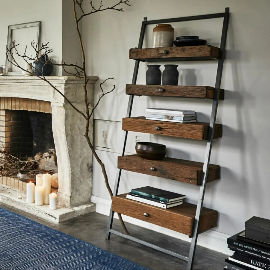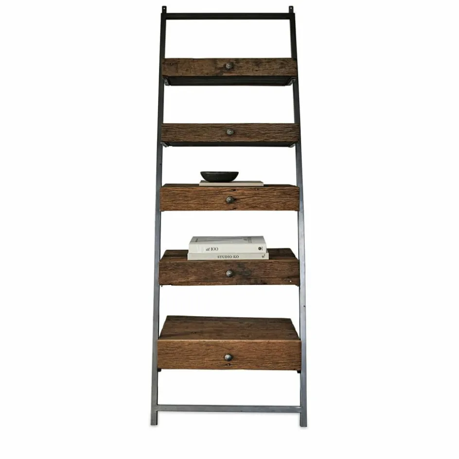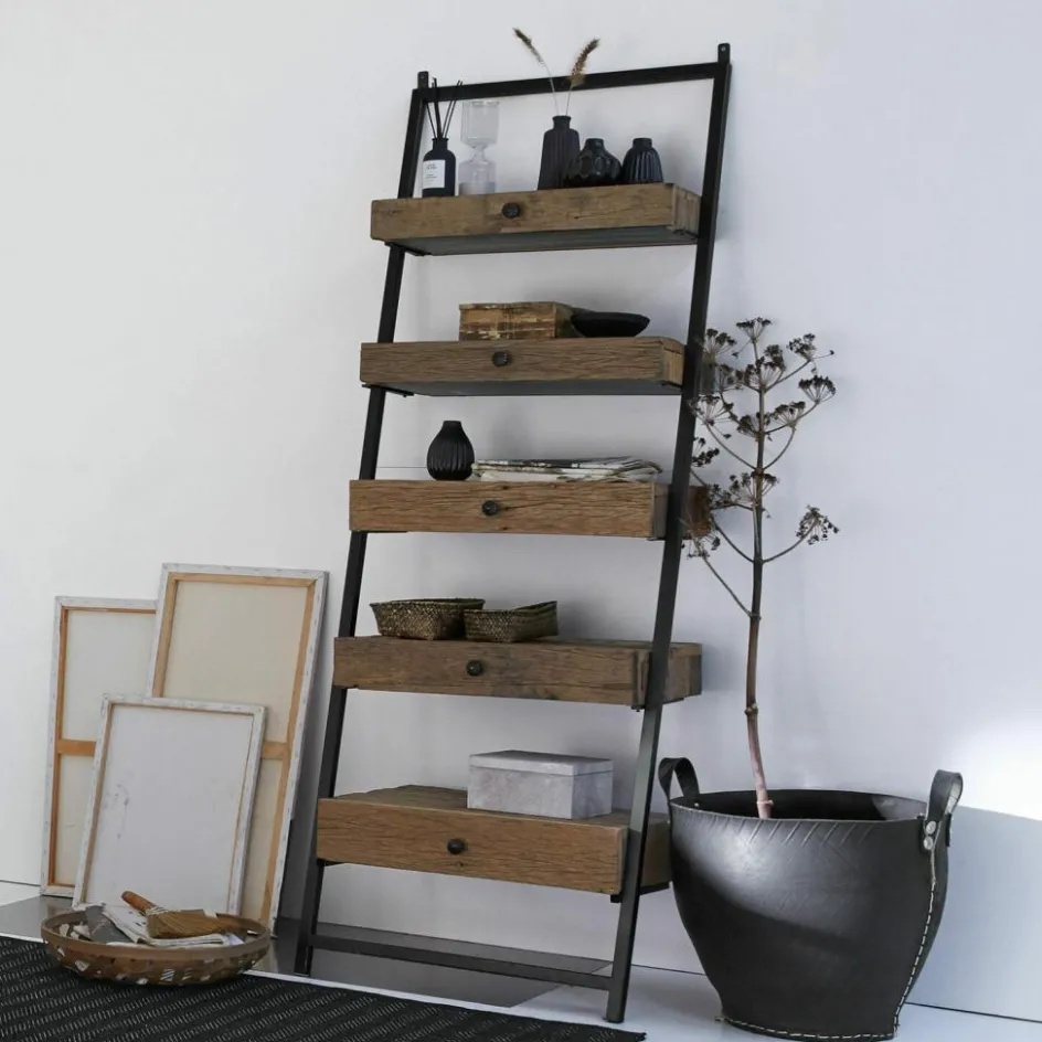 Puristisch in der Form, eindrucksvoll in der Raumwirkung. Ein Regal in Leiter-Optik wird stets die Blicke auf sich lenken, wo auch immer es an der Wand lehnt: im Wohnraum, im Speisezimmer, im Bad oder im Eingangsbereich des Hauses. Seine einzigartige Blickfangwirkung hat es neben der Leiterform vor allem der charakterstarken Maserung des Holzes zu verdanken. Wie Sie vielleicht schon vermutet haben, handelt es sich um wiederaufbereitetes Salbaumholz, dem in einem aufwändigen Prozess ein zweites Leben geschenkt wurde. Und das dadurch nochmals an Ausstrahlungskraft gewonnen hat. Doch neben dem Design wurde auch der praktische Aspekt nicht vergessen, denn das Regal hat keine üblichen Regalböden, sondern Schubladen. Das gibt Ihnen die Möglichkeit, auch die optisch weniger dekorativen Dinge, die Sie aber gerne griffbereit haben, auf attraktive Weise zu verstauen. Und das sogar auf fantastisch kleinem Raum, denn das Regal erstreckt sich an der Wand zwar mannshoch, hat aber nur eine Tiefe von ca. 40 cm. Gehalten werden die antikbraunen Schubladen von einem schlichten Eisengestell, das perfekt mit der natürlichen Holzoberfläche harmoniert. Die Eisengriffe an den Schubladen sind hübsch verziert.