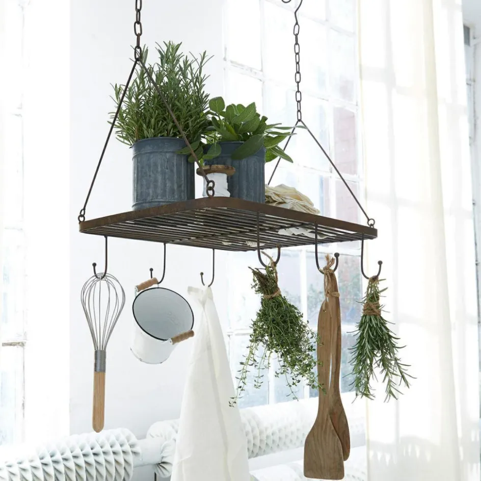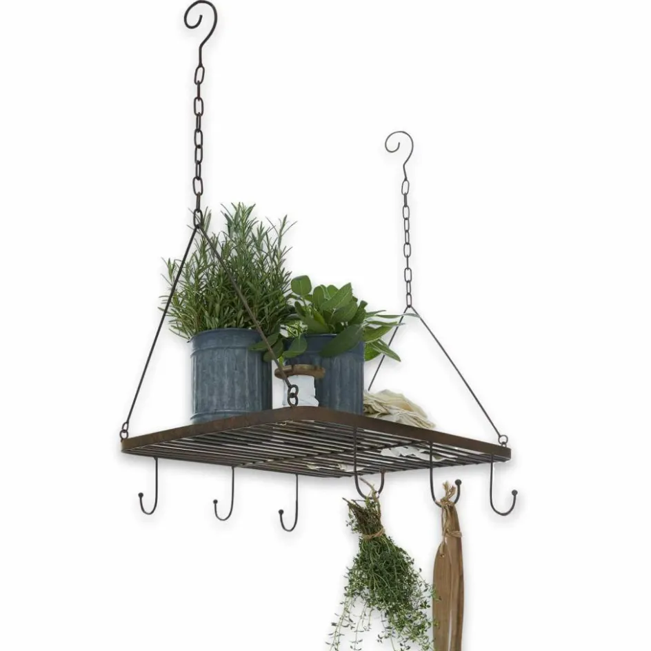Schlicht und raffiniert: Ein Gewürzregal mit Gitter und Haken. Sie kochen gerne mit selbst gezogenen Kräutern aus dem Garten? Dieses Gewürzregal kann einfach von der Decke abgehängt werden. Es schafft stilvoll Ordnung und Übersichtlichkeit. Es bietet fünf Haken an denen Sie Ihre Gartenkräuter zum Trocknen aufhängen können. Diese Kräutersträußchen sind schnell greifbar und verströmen ihren herrlich würzigen Duft in Ihrer Küche. Auf dem Gitter haben Sie Platz für kleine frische Kräutertöpfchen. Auch kleine Anzuchtschalen können Sie auf dem Gitter wunderbar unterbringen. Wenn Sie noch mehr Platz benötigen, können Sie weitere Haken im Gitter einfügen, um etwa einen Schinken oder eine Salami abzuhängen. Das Gewürzregal kann ebenfalls als romantisches Accessoire Ihrer überdachten Terrasse dienen. Kleine farbenfrohe Blumensträußen an den Haken und eine Schale mit weich herabfallendem Efeu auf dem Gitter wäre eine von zahlreichen romantischen Kombinationen. Träumerische Romantik oder stilvoll und praktisch − das Gewürzregal aus Eisen begeistert mit seinem robusten, offenen und vielseitigen Design