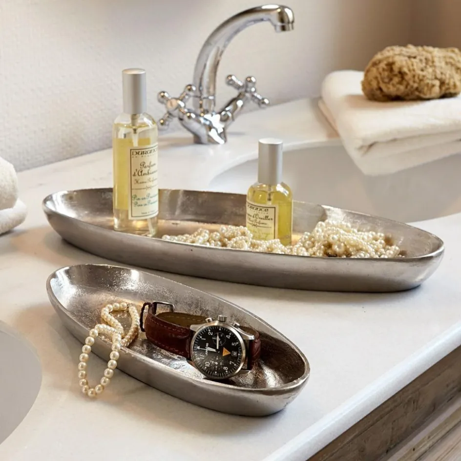 In zwei Größen! Die beiden eleganten Schalen in lang gestreckter Form sind perfekt Deko-Objekte geeignet. Wunderschön auch als Ablageschalen im Bad. Edel im Look der schwere Aluguss mit glanzvollem Antik-Finish.