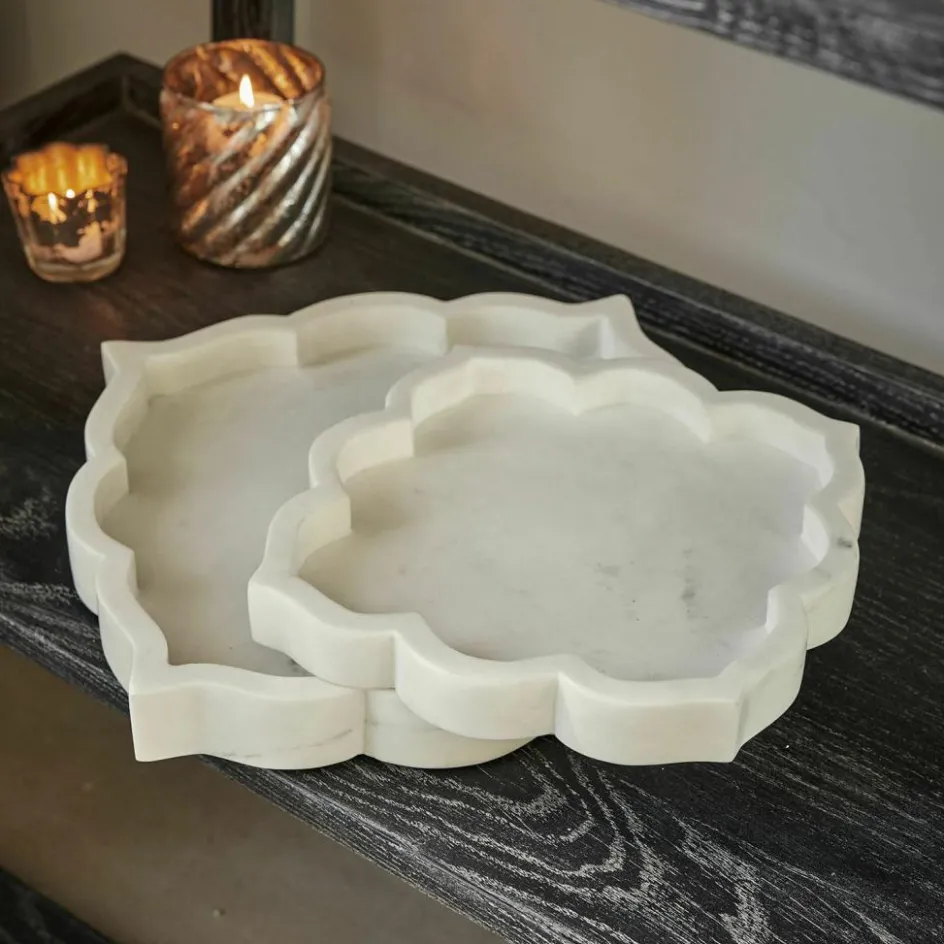 Zwei Schalen, wie aus einem Guss und doch jede für sich einzigartig – gefertigt aus echtem Marmor, erzählen sie von der stillen Kraft natürlicher Materialien. Ihre außergewöhnlich geschwungene Kontur erinnert an orientalische Ornamente und verleiht den Stücken fast etwas Blütenhaftes. Die Oberfläche ist seidig matt und zeigt feine Strukturen und Farbnuancen, wie nur echter Stein sie hervorbringen kann. Ob auf der Konsole, dem Couchtisch oder im Bad – diese Schalen fügen sich mit leiser Raffinesse in jedes Ambiente und setzen besondere Lieblingsstücke perfekt in Szene.