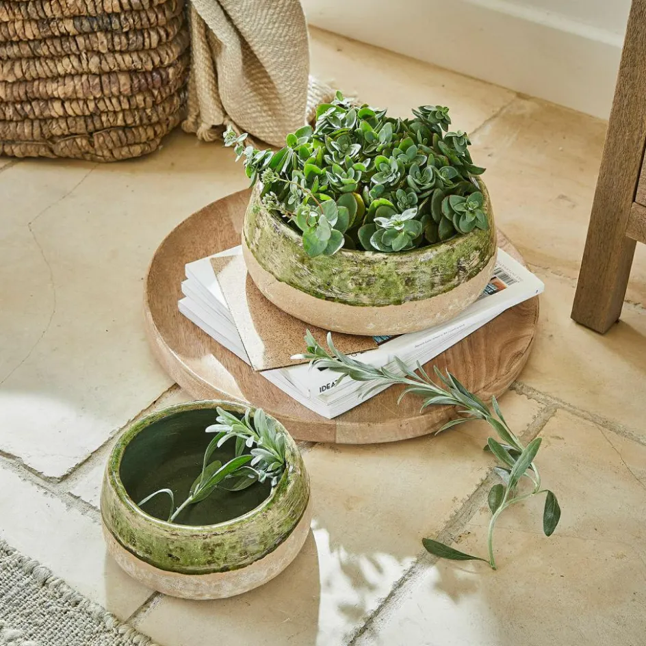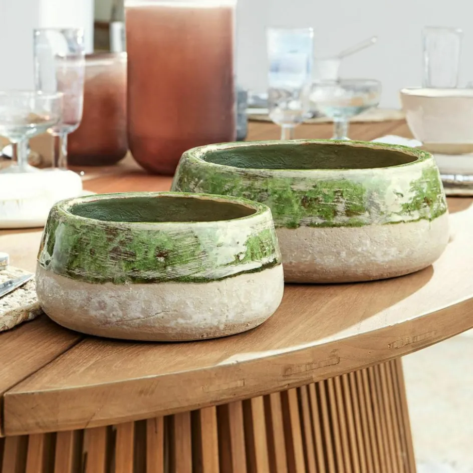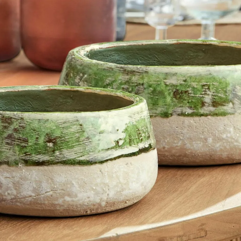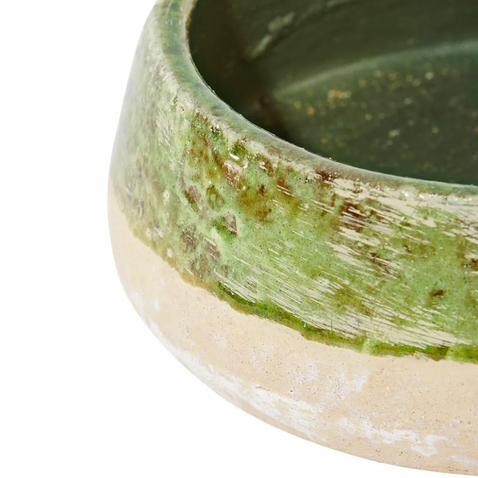 Erwecken Sie mit diesem 2er Set handgefertigter Terrakottaschalen ein Gefühl von ländlicher Eleganz in Ihrem Wohnraum. Jede Schale erzählt durch ihre individuelle Handglasur und die sichtbare Textur der Terrakotta eine Geschichte von Handwerkskunst und Liebe zum Detail. Der Kontrast zwischen der lebendigen grünen Glasur und dem natürlichen Terrakottaton ergänzt einander und schafft eine warme, einladende Atmosphäre. Egal ob als Ablage für Schlüssel und Kleinigkeiten oder als dekoratives Element auf einem Tisch oder einer Anrichte, diese Schalen verbinden Funktionalität mit einer ansprechenden Ästhetik, die den ländlichen Charme mit moderner Wohnkultur verknüpft.