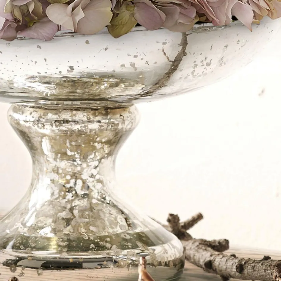 Die Schale in eleganter Pokalform wurde aus robustem schweren Glas gefertigt und von innen nach Bauernsilber-Art verspiegelt. Der edle Vintage-Look des großformatigen Gefäßes eignet sich so ganz wunderbar zum Servieren von Gebäck oder Nüssen – fungiert jedoch als strahlender Höhepunkt und stilvoller Sockel für allerlei kreative Deko-Ideen.