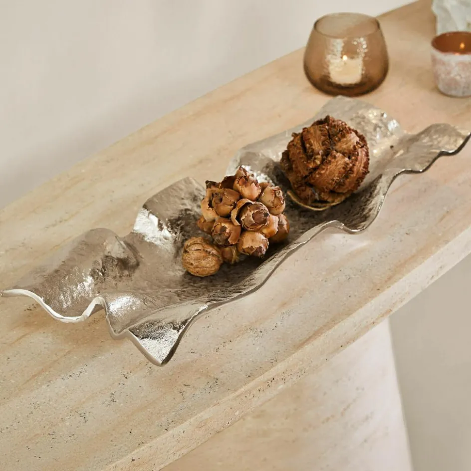 Entdecken Sie die Schönheit und Handwerkskunst dieser beeindruckenden Schale aus Aluguss. Jede Kurve und jede Struktur erzählt von der sorgfältigen Handarbeit, die in dieses Stück geflossen ist. Die silberfarbene Oberfläche schimmert im Licht und hebt die kunstvollen Details hervor, die diese Schale so besonders machen. Sie ist nicht nur ein funktionales Dekorationsobjekt, sondern auch ein Statement für Stil und Eleganz. Perfekt für Ihre exklusiven Arrangements, sei es im Wohnzimmer oder auf einem Sideboard – diese Schale bringt einen Hauch von Luxus in Ihr Zuhause.