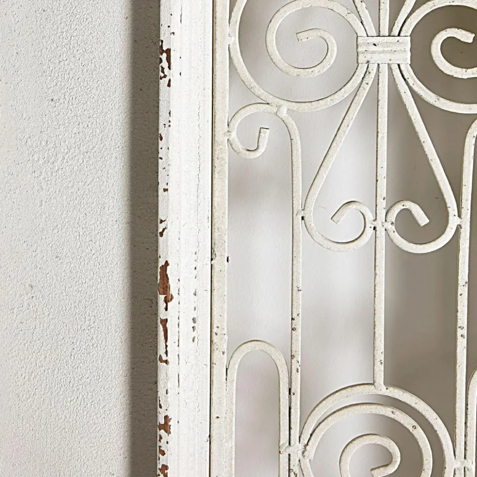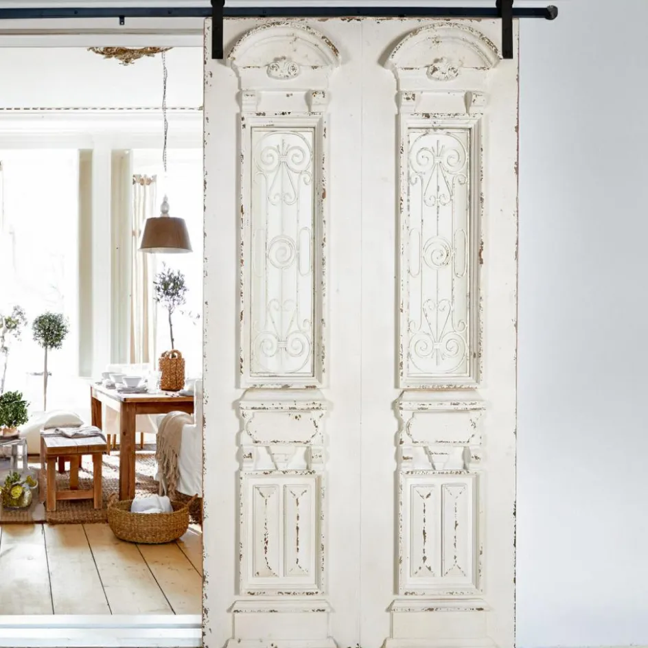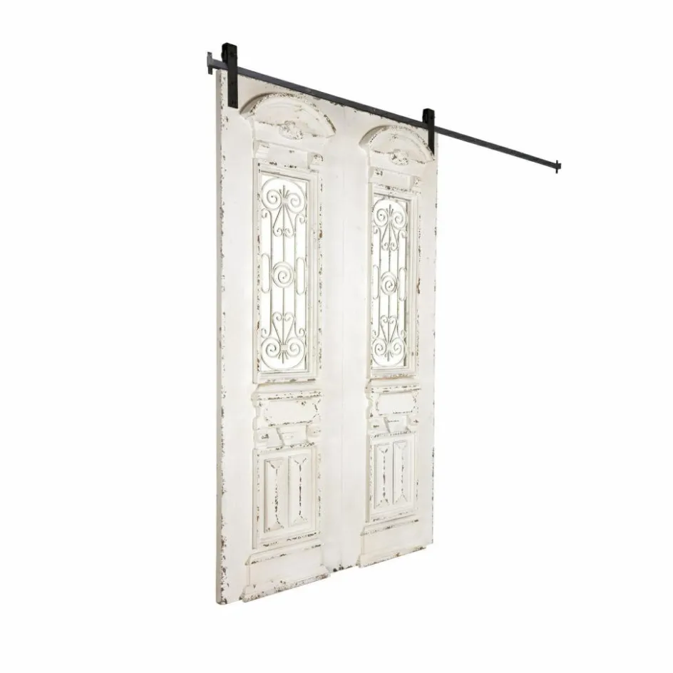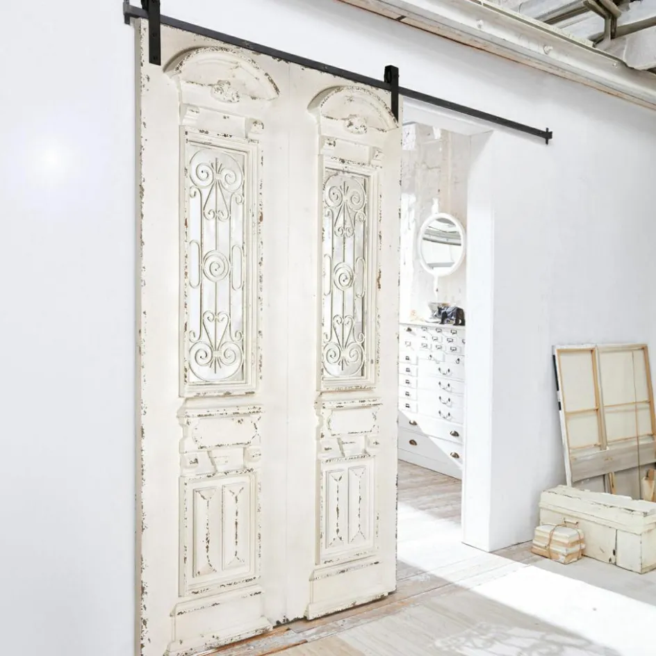Wer mag einst Tag für Tag durch diese Tür geschritten sein und wo stand wohl das Haus, zu dem diese prachtvolle Tür den Eintritt erlaubte? Wer eine Passion für das Flair vergangener Zeiten in sich spürt, wird vom Anblick dieser Schiebetür hingerissen sein. Denn hier ist dem Künstler ein echtes Meisterwerk gelungen, das den Vergleich mit seinen antiken Vorbildern, die seit mehreren Jahrhunderten elegante Landsitze wie noble Stadthäuser schmücken, nicht zu scheuen braucht. Der Korpus der Schiebetür wurde ganz im traditionellen Stil aus wiederaufbereitetem Kieferholz gefertigt und mit stiltypischen Schmuckelementen versehen, die feinen Eisenverzierungen erinnern an die Ornamentik französischer Schmiedekunst. Als hätte die Schiebetür tatsächlich früher einmal irgendwo in Frankreich als elegante Haus- oder Wohnungstür gedient. Zumindest lassen ihre diversen Gebrauchsspuren auf ein hohes Alter und eine abwechslungsreiche Lebensgeschichte schließen. Was Sie beim Betrachten der Schiebetür aber wissen sollten: Den Zahn der Zeit zu beschleunigen erfordert viel Sachverstand, Geduld und große Fingerfertigkeit von Seiten des Künstlers, damit ein authentischer Antik-Look wie hier entstehen kann. Und zwar individuell bei jeder Schiebetür, so dass jede ein Unikat ist. Was liegt da näher, als dieses Objekt in Ihr Wohnambiente zu integrieren und jeden Tag diesen einzigartigen Anblick zu genießen. Sie erhalten die Tür inklusive der Schiebevorrichtung aus Eisen zum Befestigen an der Wand.