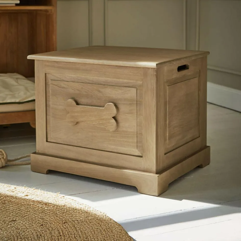 Ordnung kann so charmant sein: Diese liebevoll gestaltete Truhe aus naturbelassenem Mangoholz vereint praktische Aufbewahrung mit einer Prise Humor und Designgefühl. Der aufgesetzte Hundeknochen auf der Front macht sofort klar, wer hier im Mittelpunkt steht – Ihr treuer Vierbeiner. Im Inneren wartet großzügiger Stauraum auf alles, was das Hundeherz begehrt: Spielzeug, Accessoires, Kuscheldecke oder Snacks. Der Deckel schließt sanft und leise – perfekt für geräuschempfindliche Fellnasen. Ob im Flur, Wohnbereich oder neben dem Körbchen – diese Truhe sorgt für Ordnung mit Stil und bringt zugleich ein Augenzwinkern ins Zuhause.
