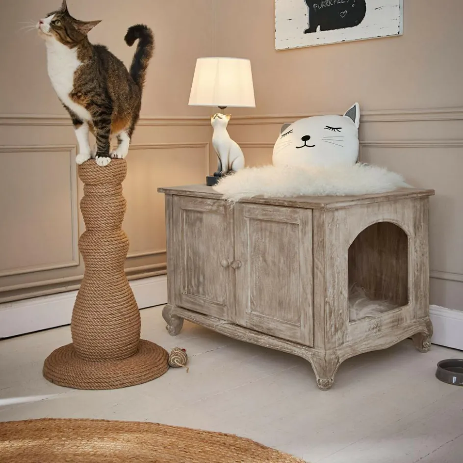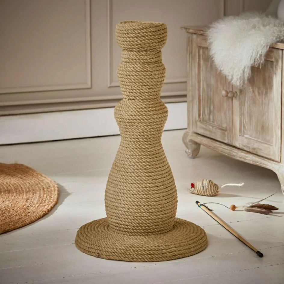 Wer sagt, dass Funktionalität und Ästhetik sich ausschließen müssen, kennt diesen außergewöhnlichen Kratzbaum noch nicht. Die geschwungene Silhouette erinnert an eine kunstvolle Skulptur, während das naturbelassene Juteseil spannungsreich um den soliden Mahagonikern gewunden ist – ein harmonisches Zusammenspiel von Material und Form. Katzen finden hier ein Objekt, das sie mit Stolz beanspruchen können. Und auch für die menschlichen Mitbewohner wird dieser Kratzbaum zum stilvollen Statement – charmant natürlich, angenehm unaufdringlich und dabei unverkennbar besonders.
