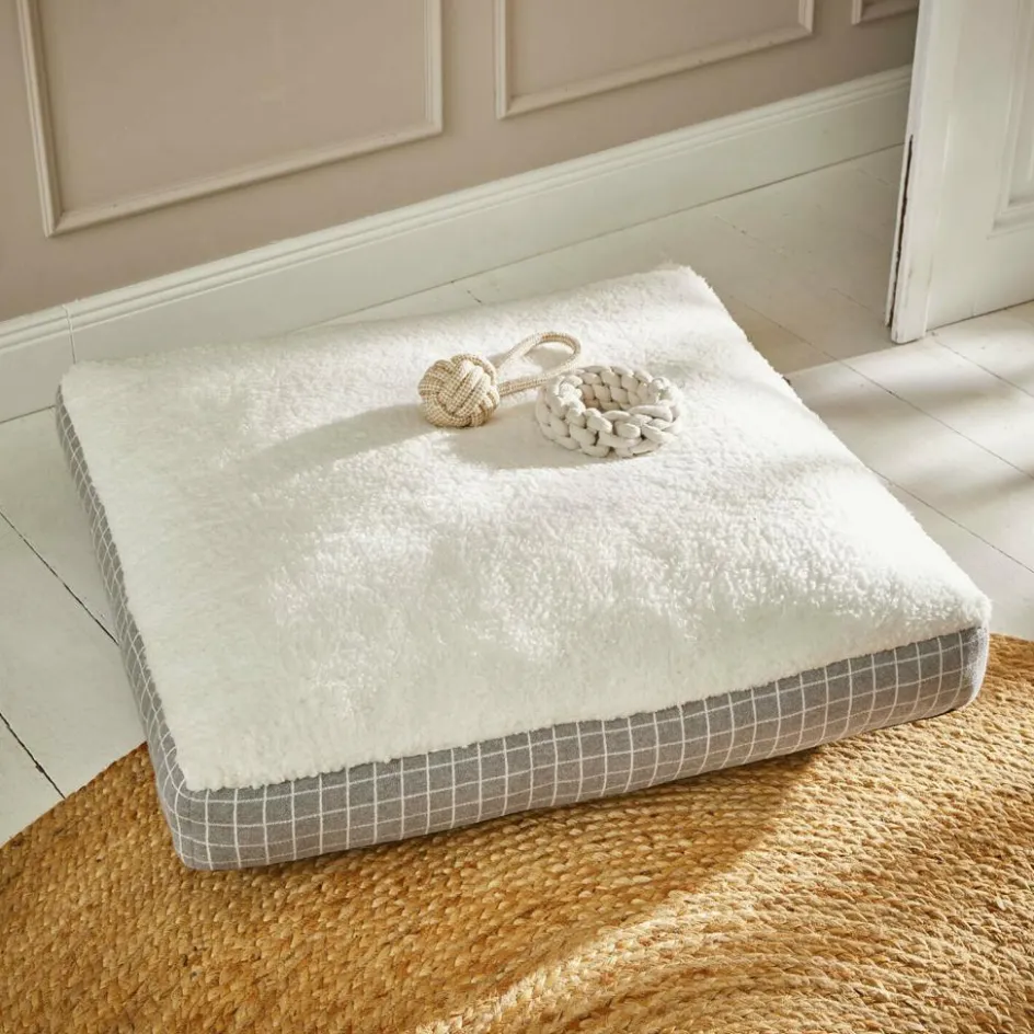 Ob nach einem langen Spaziergang, einer wilden Spielrunde oder einfach für die tägliche Portion Gemütlichkeit – diese Haustiermatratze ist wie gemacht für entspannte Stunden. Die flauschige Oberseite in wollweißem Teddyfleece sorgt für ein wohliges Gefühl, das fast an ein warmes Nest erinnert. Die Seiten in dezentem Karo-Design bringen dabei eine sanfte Eleganz ins Zuhause. Und die rutschfeste Unterseite mit leichten Noppen hält das Kissen an Ort und Stelle. Der waschbare Baumwollbezug lässt sich mühelos abnehmen und reinigen – für ein dauerhaft gepflegtes Plätzchen. Ein Wohlfühlort, der Ihrem Haustier Geborgenheit schenkt und optisch mühelos in jede Einrichtung passt.