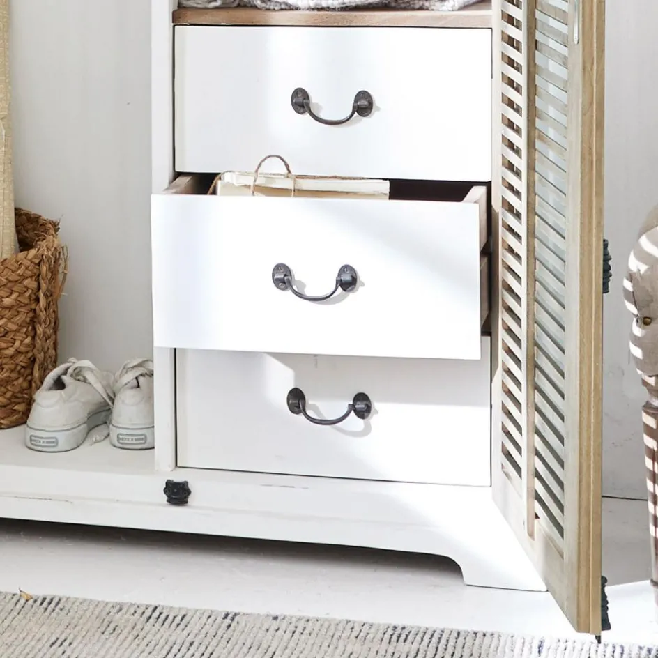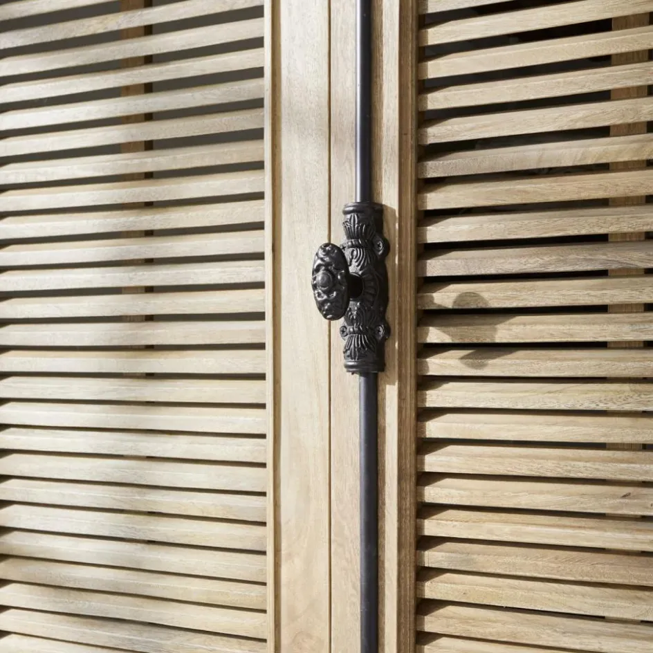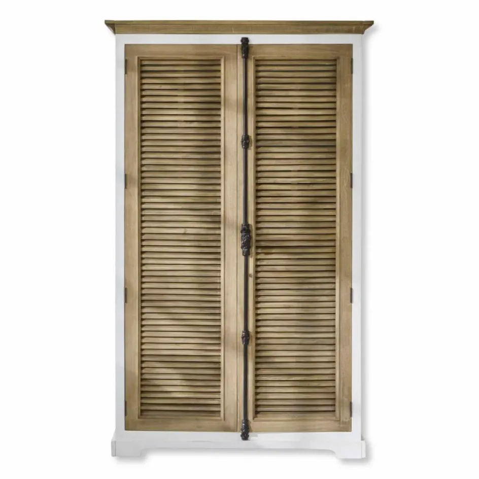 Stille Eleganz in Mangoholz: Dieser hochwertige Kleiderschrank im französischen Landhausstil ist in liebevoller Handarbeit gefertigt und besticht durch sein klares und zurückhaltendes Design. Er besteht aus robustem Mangoholz, das ebenso pflegeleicht wie widerstandsfähig ist. Die Türen sind durch ihre stilvolle Lamellenstruktur ein echter Eye-Catcher. Werden sie geöffnet, findet sich im Inneren ein großer Bereich mit einer Stange für Ihre Kleiderbügel, ideal für Hemden, Blusen, Sakkos und andere Kleidungsstücke, die vor Falten bewahrt werden sollen. Die zweite Schrankhälfte ist aufgeteilt in drei Ablage- und drei Schubladenfächer, sodass alles seinen rechten Ort findet. So bietet dieses Ordnungstalent viel Platz für Ihre Garderobe. Und wenn Ihr Bedarf größer ist, lässt sich der Schrank als Teil einer großen modularen Schrankkombination ganz einfach mit zusätzlichen Modulen im selben Stil erweitern. Die Kranzleiste und die Sockelleiste sind abnehmbar, damit Sie diese bei Bedarf noch an die aufsetzbaren Schrankelemente anbringen und eine in sich geschlossene Optik genießen können.