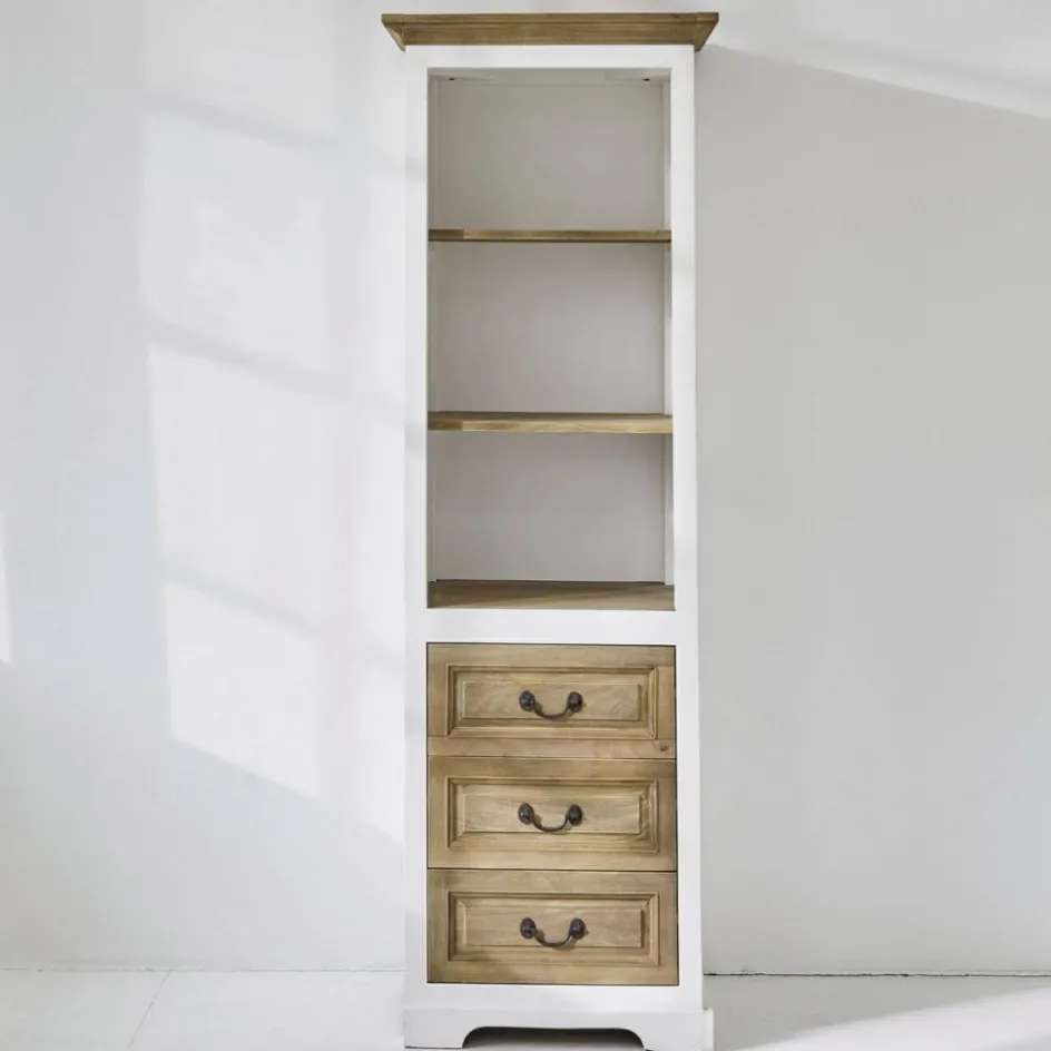 Dieser hochwertige Kleiderschrank im französischen Landhausstil ist aus robustem Mangoholz gefertigt und das Ergebnis liebevoller Handarbeit. Sein klares, aufgeräumtes Design bereichert jedes Wohnambiente. Mit mehreren Ablagemöglichkeiten und seinen drei Schubladenfächern ist er ideal fürs Schlaf- oder Badezimmer: Durch die offene Form sind Handtücher und Bettwäsche jederzeit schnell griffbereit. Aber natürlich macht der Schrank auch an allen anderen Orten eine gute Figur und kann auch für Pullis, Pullunder, Jeanshosen und andere Kleidungsstücke genutzt werden. Die Schubladen sind ideal für Socken, Strümpfe, Tücher oder Waschlappen. Sollte Ihr Bedarf wachsen, lässt sich der Schrank ganz einfach mit zusätzlichen Modulen im selben Stil erweitern, da er sich auch als Teilelement in eine modulare Schrankserie einbinden lässt. Aus diesem Grund sind die Kranzleiste und die Sockelleiste abnehmbar. So können Sie diese bei Bedarf an die zusätzlichen Schrankelemente anbringen und sich an einem einheitlichen Erscheinungsbild erfreuen.