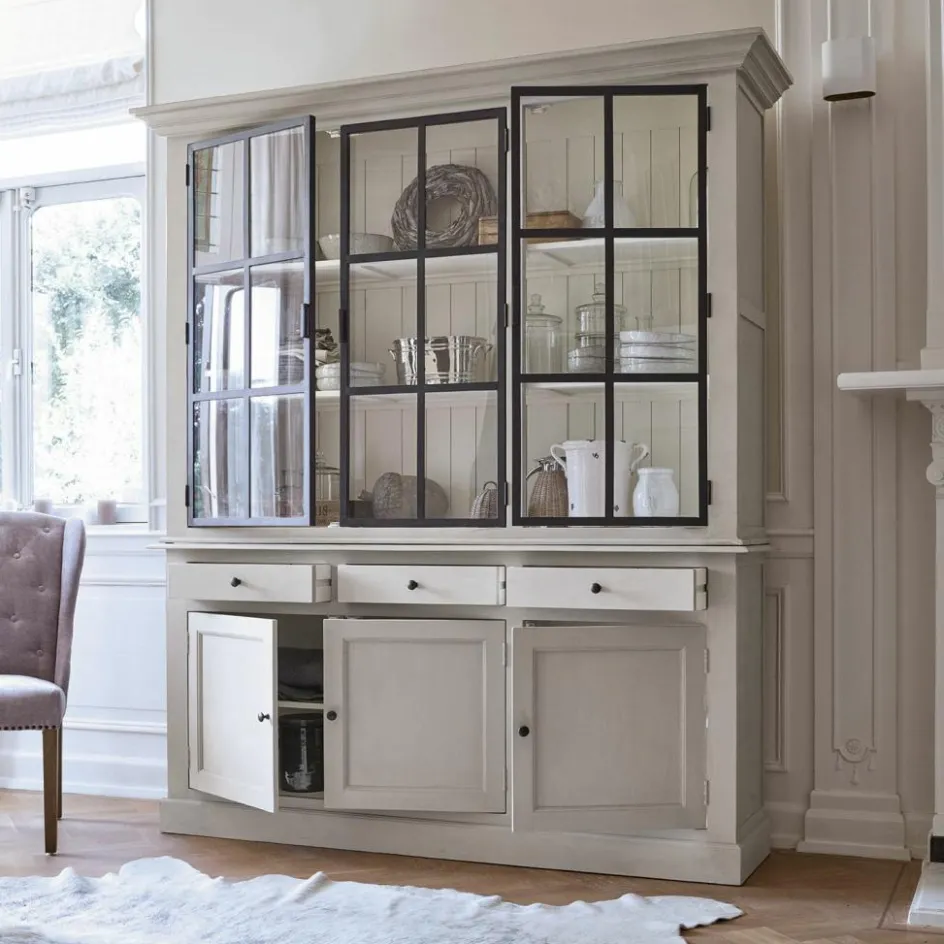 Edles Holz und Gusseisen sind bewährte Elemente des traditionellen Landhaus-Stils, selten aber sieht man sie so raffiniert kombiniert wie hier. Dieses Highlight traditioneller Möbelkunst wird Räume mit heimeliger Wohnlichkeit bereichern und dabei das nostalgische Flair längst vergangener Zeiten wachrufen, als die Uhren noch langsamer gingen und die Menschen mehr Zeit für Muße und Entspannung hatten. Um diese heiter gelassene Stimmung auch in Ihnen wachzurufen, reicht ein Blick auf die zahlreichen, liebevoll von Hand gefertigten Details wie den aufwändigen Kranz, den Versatz in der Mitte und die sauber gearbeiteten Kassettentüren. Die außergewöhnliche Raumpräsenz aber verdankt der Schrank den hohen Sprossentüren, die mit dunklen, gusseisernen Rahmen gefasst sind und in markantem Kontrast zu dem hellen Korpus stehen. Ein Schrank wie gemacht für elegante Wohn- und Speisezimmer, wo Sie Ihr gutes Geschirr, die edlen Gläser, die Tischwäsche, aber auch lieb gewonnene Accessoires unterbringen können. Dafür stehen Ihnen geschlossene Unterschränke, Schubladen sowie die Fächer hinter den Glastüren zur Verfügung. Die Rückwand hinter den Glastüren ist sorgfältig aus hellen Latten gefertigt, so dass dort platzierte Objekte besonders schön zur Geltung kommen. Ein solcher Schrank passt aber nicht nur in klassische Wohn- oder Speisezimmer, sondern auch in moderne Raumsituationen, in denen – wie heutzutage immer häufiger üblich – die Grenzen zwischen Kochen, Speisen und Wohnen verschwimmen und im Grund alles in einem großen Raum stattfindet.