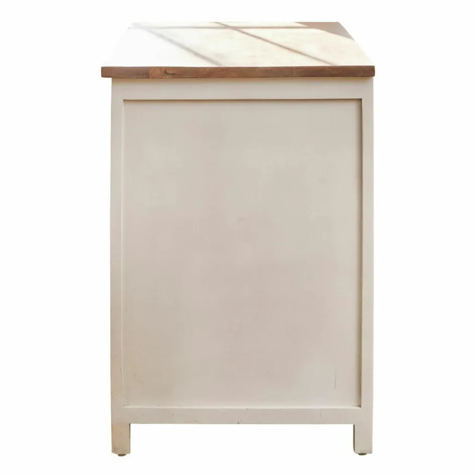 Mit der Hand über die massive, naturbelassene Arbeitsplatte streichen und die ausdrucksstarke Maserung des Mangoholzes bewundern, mit den Fingerspitzen in die hübschen Muschelgriffe greifen, um die große Schublade zu öffnen – Handgriffe, die Sie bestimmt immer wieder gerne machen werden, wenn dieser charmante Schrank erst in Ihrer Küche steht. Hinter seinem zweifarbigen Äußeren, das frisches Landhaus-Flair versprüht, verbirgt sich jede Menge Stauraum, den Sie ganz nach Ihren Wünschen für Geschirr, Besteck, Schüsseln und Co nutzen können. In bester Handwerksmanier aus edlem Mangoholz geschreinert wird Ihnen der Schrank Jahr für Jahr gerne zu Diensten sein. Er eignet sich ideal, um in Kombination mit den anderen Küchenmodulen – Spülenschrank (23193), Schrank (23195) oder Küchenblock (23194) – zu Ihrer individuell gestalteten Küchenzeile zu verschmelzen. Wenn Sie es wünschen, wird der Schrank sich aber auch gerne in einem anderen Raum als Kommode mit moderner Landhaus-Ausstrahlung für Sie nützlich machen.
