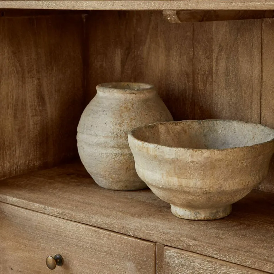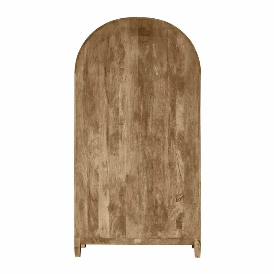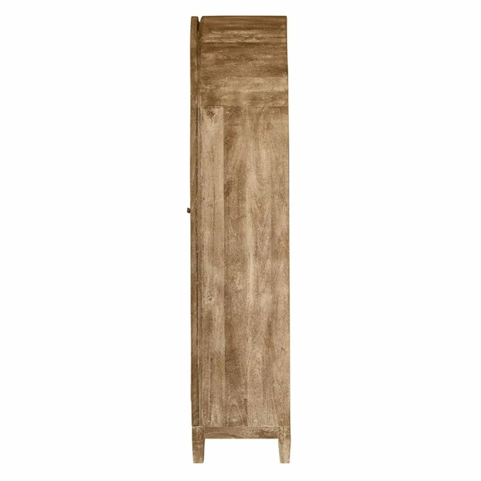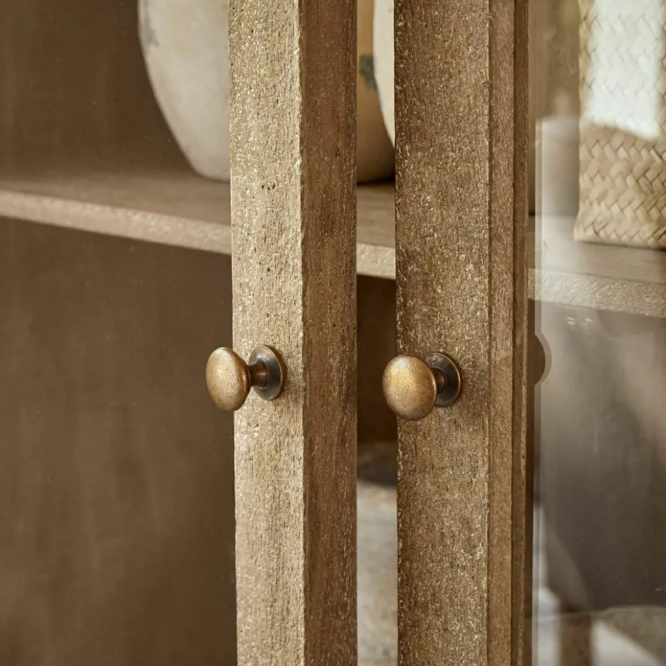 Dieser Schrank ist ein echtes Charakterstück – sein hoher, rund geschwungener Aufbau erinnert an antike Vitrinen, neu interpretiert mit modernem Feingefühl. Die Glastüren lassen Ihre schönsten Lieblingsstücke stilvoll zur Geltung kommen, während die darunterliegenden Schubladen diskret Platz für Dinge bieten, die nicht jeder sehen soll. Das sandgestrahlte Mangoholz wurde mit einem hellbraunen Finish veredelt, das die lebendige Maserung sanft betont und dem Möbelstück eine warme, geerdete Ausstrahlung schenkt. Ob im Esszimmer, Flur oder Wohnzimmer – dieses Möbelstück bringt Struktur, Leichtigkeit und Stil in Ihre Räume.