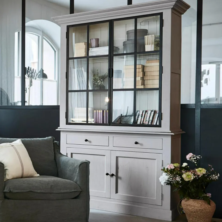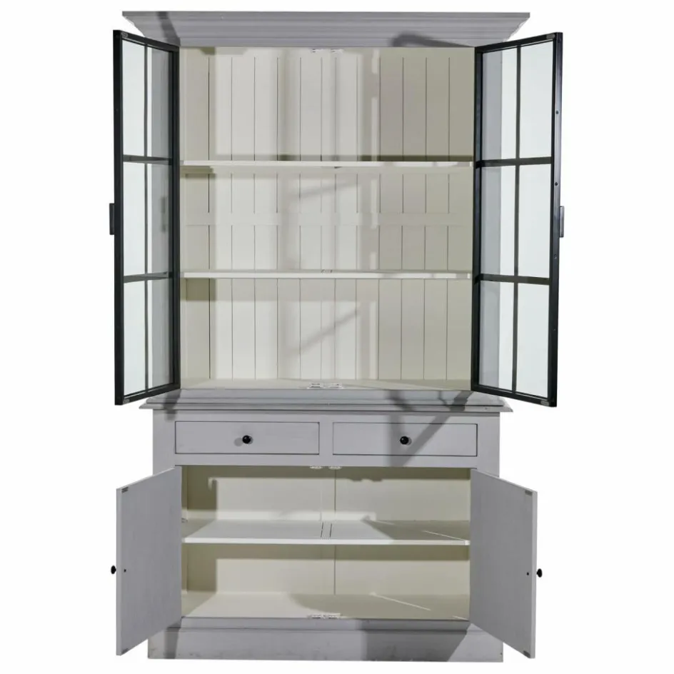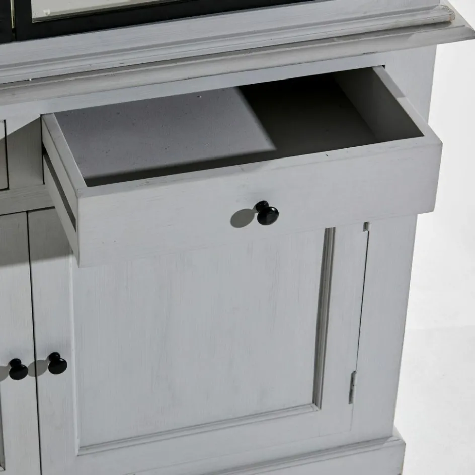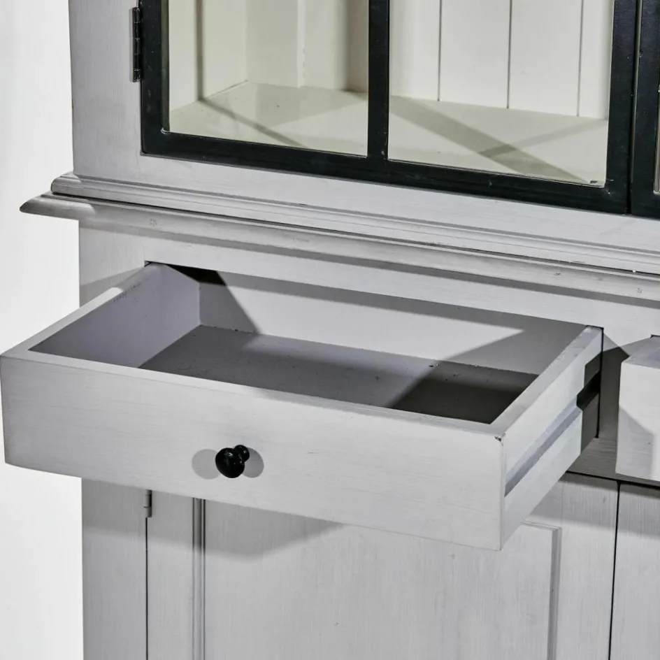 Gab es früher in herrschaftlichen Wohnsitzen neben dem Wohnzimmer auch ein Speisezimmer und eine große Küche, so verschwimmen heutzutage die Grenzen zwischen Kochen, Essen und Wohnen. Nicht nur aus Platzgründen, sondern auch, weil Kochen und Genießen lebendiger Ausdruck moderner Lebensqualität sind und überall möglich sein sollten. Was für ein Glücksfall, dass es Möbel gibt, die die noble Aura großzügiger Landsitze verströmen, sich aber ohne weiteres an moderne Wohn- und Lebenssituationen anpassen. Wie dieser Schrank, der sich in einem Wohnraum, einem klassischen Speisezimmer, aber auch in einer großzügigen Wohnküche zu Hause fühlen und seinen ländlichen Charme verbreiten wird. Ganz im Stil alter Handwerkstradition aus hochwertigem Mangoholz und markanten Eisenelementen gefertigt, verfügt der Schrank über eine beeindruckende Raumpräsenz, zu der auch die stattliche Höhe ihren Beitrag leistet. Außerdem hat sich der Schrank mit allen liebevollen Details geschmückt, die zum klassischen Landhaus-Look gehören wie einem aufwendigen Kranzprofil, Sprossen und Kassettentüren. Überraschend modern wirkt dagegen der Kontrast zwischen dem hellen Grauton des Holzes und den schwarzen Zierleisten aus Eisen. Nicht zuletzt begeistert der Schrank aber auch mit seinem großzügigen und vielfältigen Stauraum: auf drei Etagen hinter den Glastüren, in zwei Schubladen und zwei Regalböden hinter den geschlossenen Schranktüren.