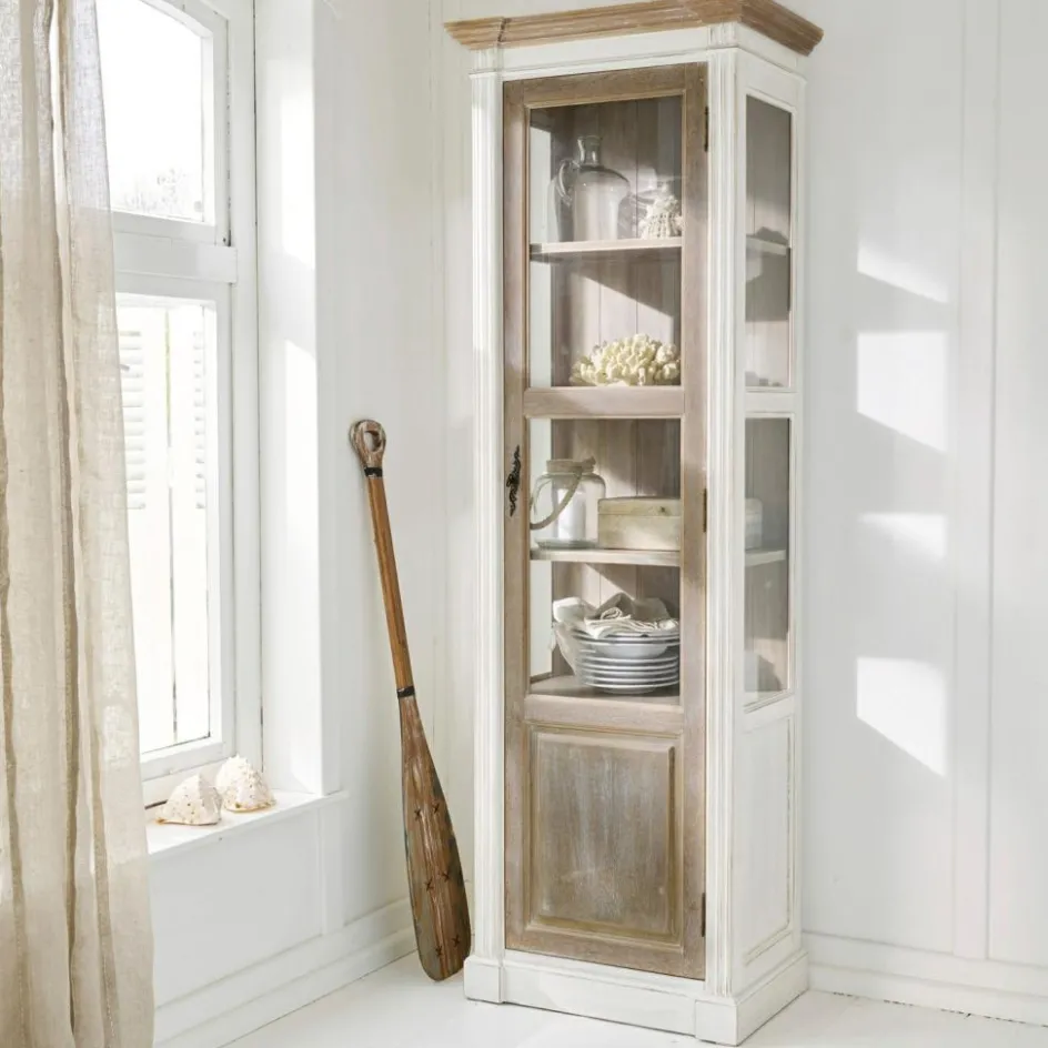 Ein ausgesprochen elegantes und klassisches Design, das nicht nur Freunde des Landhaus-Stils begeistern wird. Durch die hohe, schmale Formgebung passt der exklusive Landhaus-Schrank auch ideal in kleinere Räume. Hochwertiges Teak- und Paulowniaholz spielt hier in gekonnter Zweifarbigkeit wunderhübsch zusammen. Der raffinierte weiß gekalkte Look verleiht dem geräumigen Schrank noch mehr Charakter und eine leicht nostalgische Note. Fünf fixierte Einlegeböden bieten viel Stauraum. Ob Gläser, Geschirr, Dekoratives oder Bücher – hinter der Glastür und den verglasten Seitenwänden kommen Ihre Schätze perfekt zur Geltung. Das stabile, harmonische und edle Landhaus-Design steht für Wohnfreude, die viele Jahre lang anhalten wird.