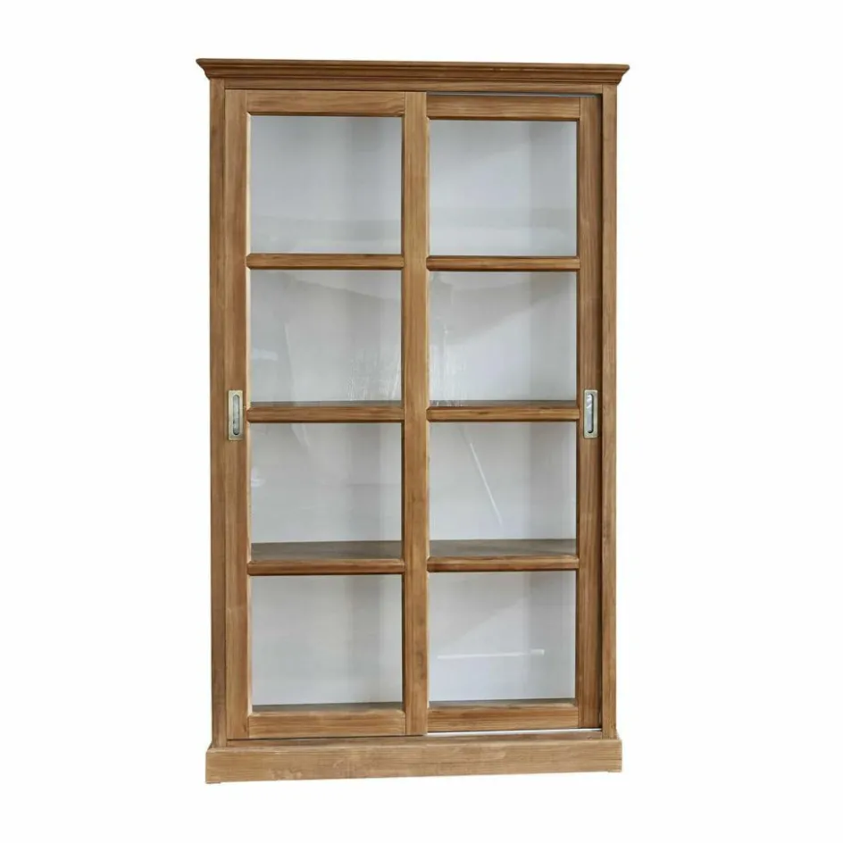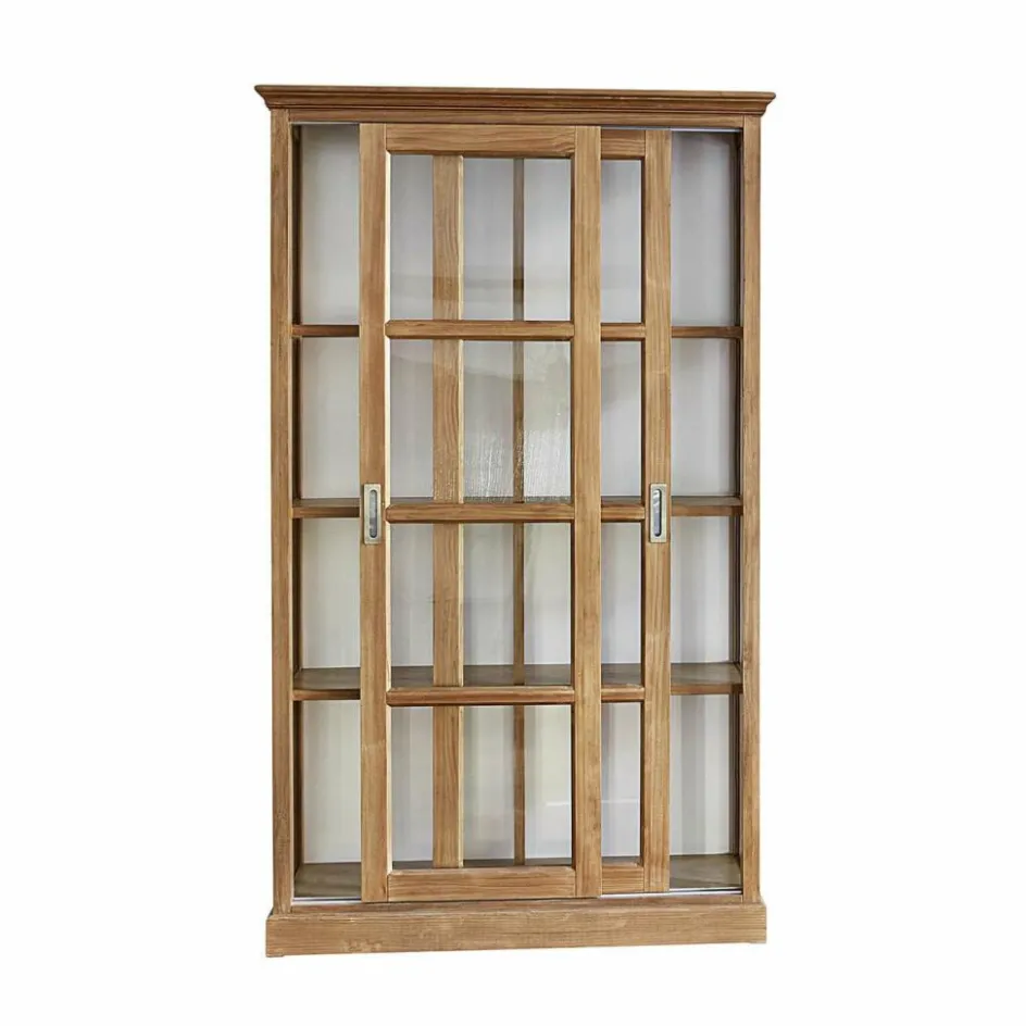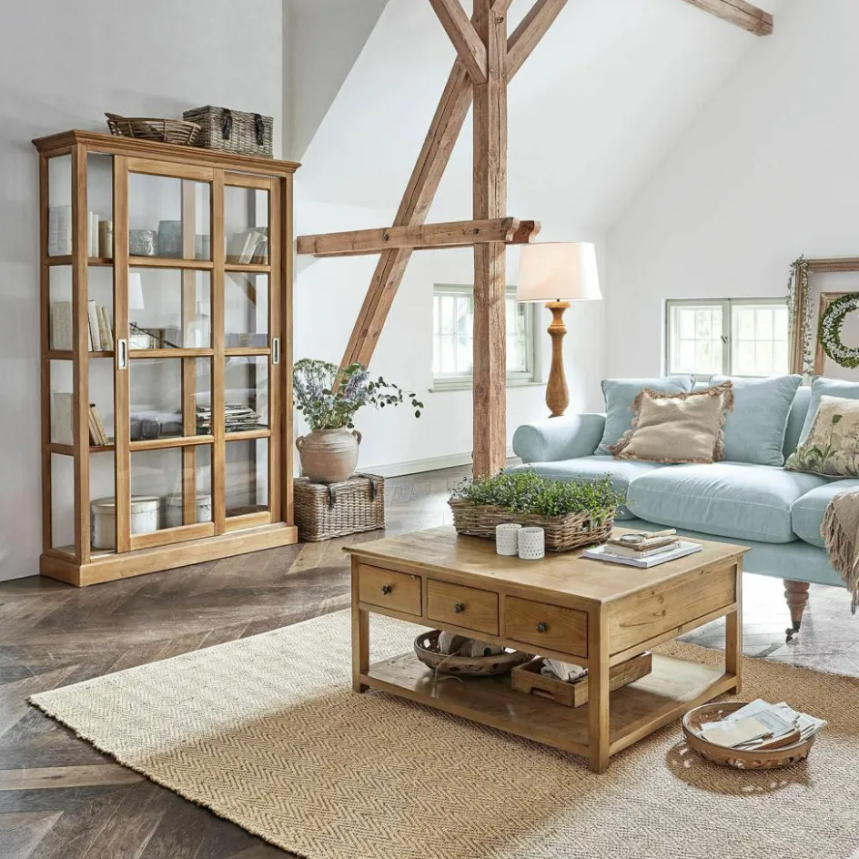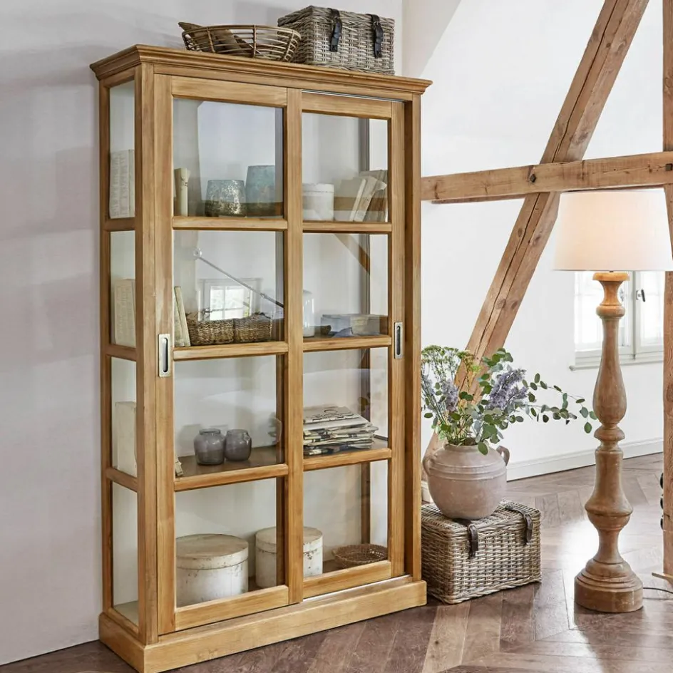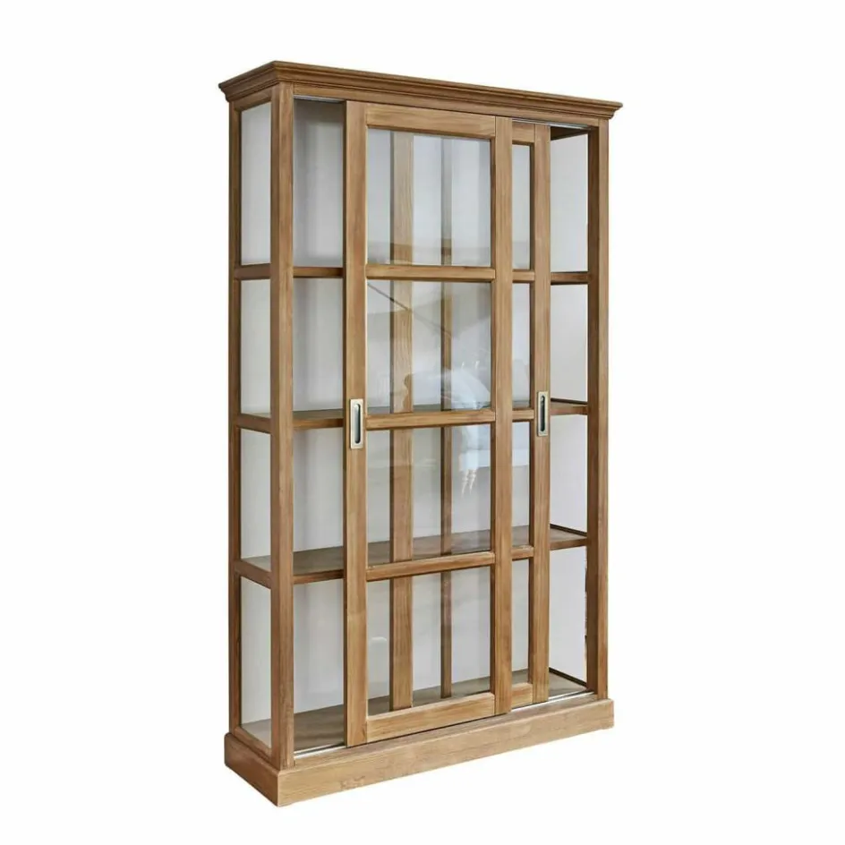 Dieser Schrank entfaltet seine besondere Raumwirkung durch das gekonnte Zusammenspiel von Holz mit Glas. Der Korpus wurde nach allen Regeln der klassischen Handwerkskunst aus Kieferhnolz gefertigt und mit einem stiltypischen Kranz und Fenstersprossen verziert, die zahlreichen Glaselemente aber, die – sogar an den Schmalseiten – den Blick durch den Schrank hindurch fallen lassen, verleihen ihm eine außergewöhnliche Transparenz. Trotz seiner stattlichen Größe wirkt er nie massiv und erdrückend, während er den Inhalt sicher vor Staub schützt. Der Schrank bringt im Wohnzimmer wertvolle Bücher und Kunstobjekte, kostbare Sammler- und geliebte Erinnerungsstücke stilvoll zur Geltung, er eignet sich aber auch, um im Speisezimmer edles Porzellan, Kristallglas und Co sicher unterzubringen. Aber wo der Schrank bei Ihnen auch stehen wird – die Schiebetüren werden sich im Alltag als sehr praktisch erweisen, denn nie steht eine Schranktür störend im Weg, während Sie etwas herausholen oder hineinstellen. Das massive Kiefernholz wurde mit einer feinen Lasur veredelt, die die typische Holzmaserung betont.