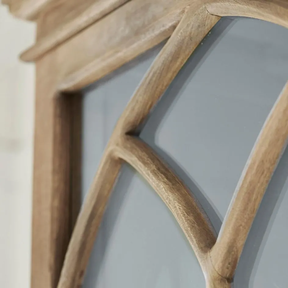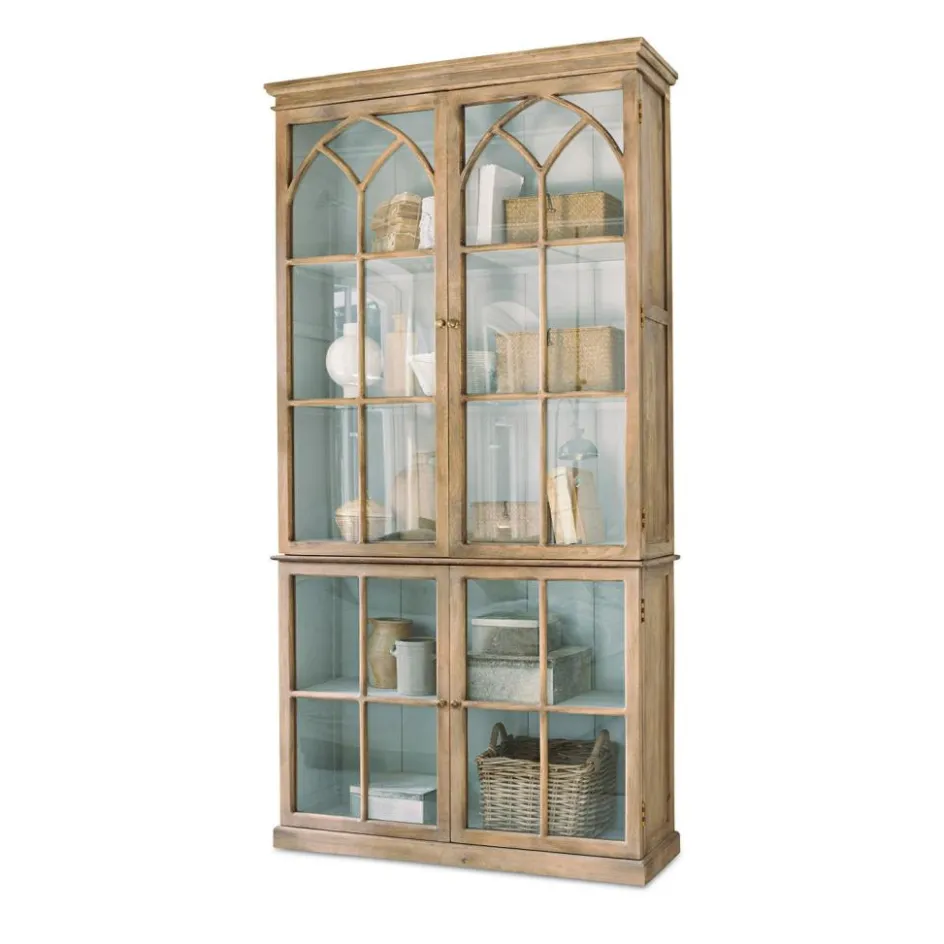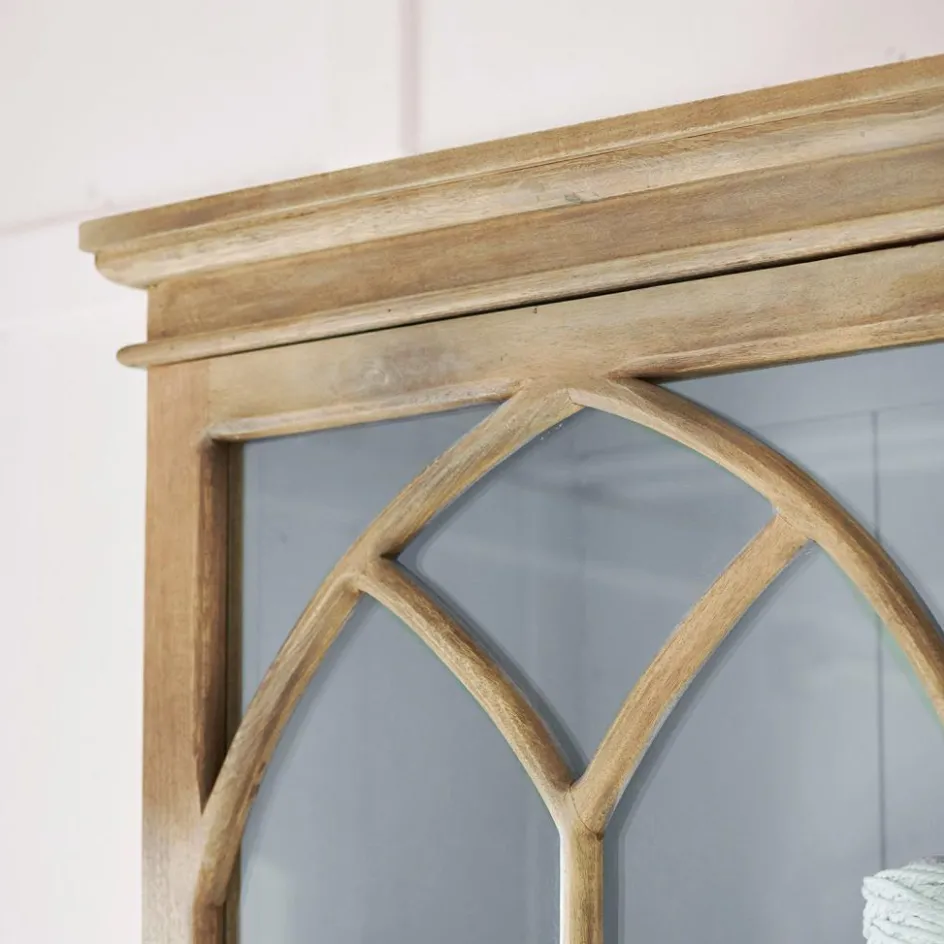 Dass dieser Schrank qualitativ etwas Besonderes ist, erkennen nicht nur Experten auf den ersten Blick. Er besteht aus massivem Mangoholz und geizt nicht mit handgearbeiteten Details. Die fein abgestufte Krone, die gelattete Rückwand, Seitenteile in Kassettenoptik und allen voran die wunderschönen Türen. Diese sind verglast und mit kunstvoll geformten Zierbögen geschmückt. Zudem ist jede Tür mit einem ganz reizenden Metallknauf besetzt. Das Interieur wurde hell lackiert und kontrastiert perfekt mit dem natürlich schönen Mangoholz. Dieses wurde in mehreren Schritten grundiert und lasiert, um die attraktive Maserung zu intensivieren. Die Liebe für Details geht so weit, dass sogar die Scharniere der Türen farblich auf das Holz abgestimmt wurden. Das schöne Stück besteht aus Ober- und Unterschrank und wird in zwei Teilen geliefert.