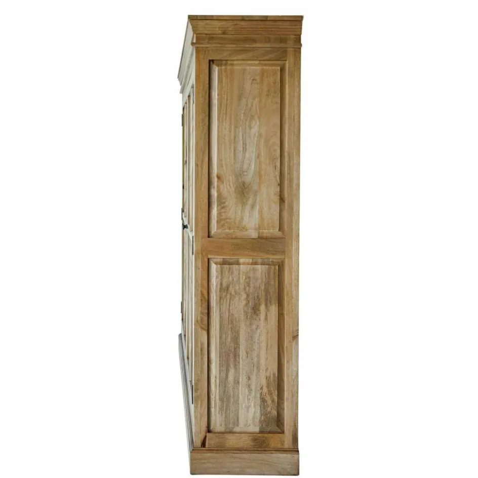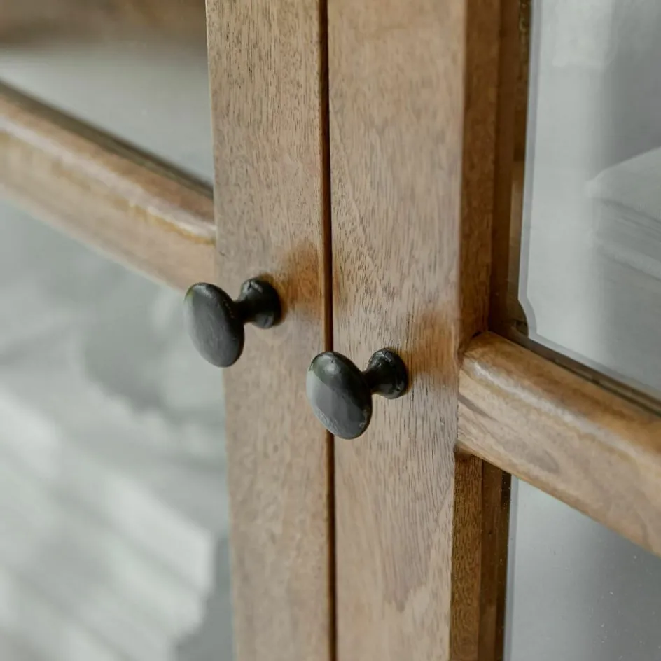 Dieser elegante Schrank aus hochwertigem Mangoholz bringt die natürliche Schönheit des Holzes durch ein leichtes Antikbraun-Finish perfekt zur Geltung. Die charakteristische Holzmaserung sorgt für einen warmen, einladenden Look, während die Sprossenfenster-Optik der Glastüren einen rustikalen Charme verleiht. Hinter den großzügigen Glastüren finden sich gut strukturierte Fächer, die reichlich Platz für Bücher, Geschirr oder dekorative Elemente bieten. Das massive Mangoholz mit seiner schönen Holzmaserung und die klaren Linien verbinden traditionelle Handwerkskunst mit moderner Eleganz. Ob als Vitrine oder als Schrank für die Präsentation und Aufbewahrung Ihrer wertvollsten Gegenstände, dieses Möbelstück wird zum stilvollen Blickfang in jedem Wohnbereich.