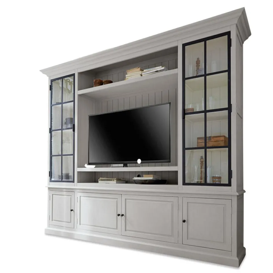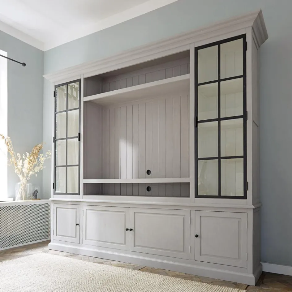 Das TV-Gerät und die Musikanlage, Bücher, CDs, Spiele, geliebte Erinnerungsstücke – im Laufe der Zeit sammelt sich in einem Haushalt eine Unmenge an Dingen an. Manche braucht man täglich, andere wieder selten und doch mag man sich nicht von Ihnen trennen. Wie schön, wenn man dann einen Aufbewahrungsort hat, der praktische Funktionalität mit Qualität und Design vollendet zu verbinden weiß! Dieser Schrank bietet Ihnen mit seinen stattlichen Maßen viel Platz für alles, was Sie im Wohnraum jeden Tag brauchen oder gerne jederzeit griffbereit hätten. Das fängt beim TV-Gerät und bei der Musikanlage an, die sich problemlos in den Schrank integrieren lassen, denn in der Rückwand sind bereits Aussparungen für die Kabel zum Anschluss der Geräte vorgesehen. Das hört bei den vielen anderen Dingen noch lange nicht auf, die Sie in den Fächern mit den Glastüren stilvoll präsentieren oder hinter den geschlossenen Schranktüten unsichtbar verstauen können. Und bei all diesen praktischen Vorzügen gelingt es dem Schrank zugleich, das optische Highlight im Wohnraum zu sein. Dazu tragen die klassischen Holztüren mit den Landhaus-typischen Verzierungen bei ebenso wie die hochwertige Lammellenrückwand und der aufwendig gearbeitete Kranzabschluss. Einen aparten Kontrast dazu bilden aber die Glastüren, deren Sprossen aus Eisen gefertigt sind und einen Hauch Industrial-Flair verbreiten. Ein Schrank, der den individuellen Charakter Ihres Zuhauses perfekt unterstreicht.