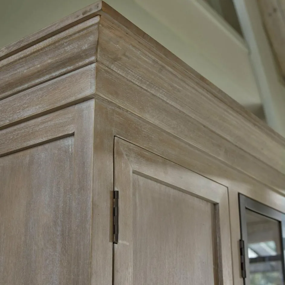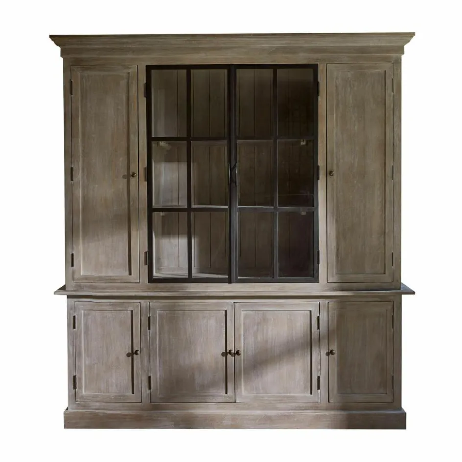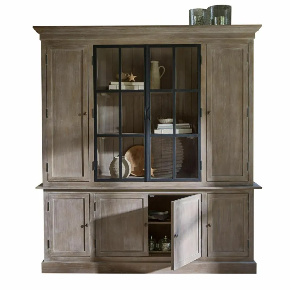 Ein wahrer Hingucker und Meisterwerk der Handwerkskunst: Dieser Schrank aus massivem Mangoholz strahlt mit seinem Antikgrau-Finish eine zeitlose Eleganz aus. Die feinen Holzmaserungen sind deutlich sichtbar und verleihen jedem Stück eine individuelle Note. Die mittleren Türen aus robustem Eisen, kombiniert mit klaren Glaseinsätzen, setzen einen modernen Akzent und ermöglichen einen Blick auf Ihre wertvollen Stücke im Inneren. Die Rückwand im Inneren, gestaltet in einer charmanten Lamellen-Optik, harmoniert farblich perfekt mit der äußeren Oberfläche des Schranks. Dieser Schrank ist nicht nur ein praktisches Möbelstück, sondern auch ein stilvolles Statement, das Ihrem Wohnraum eine edle und einladende Atmosphäre verleiht.