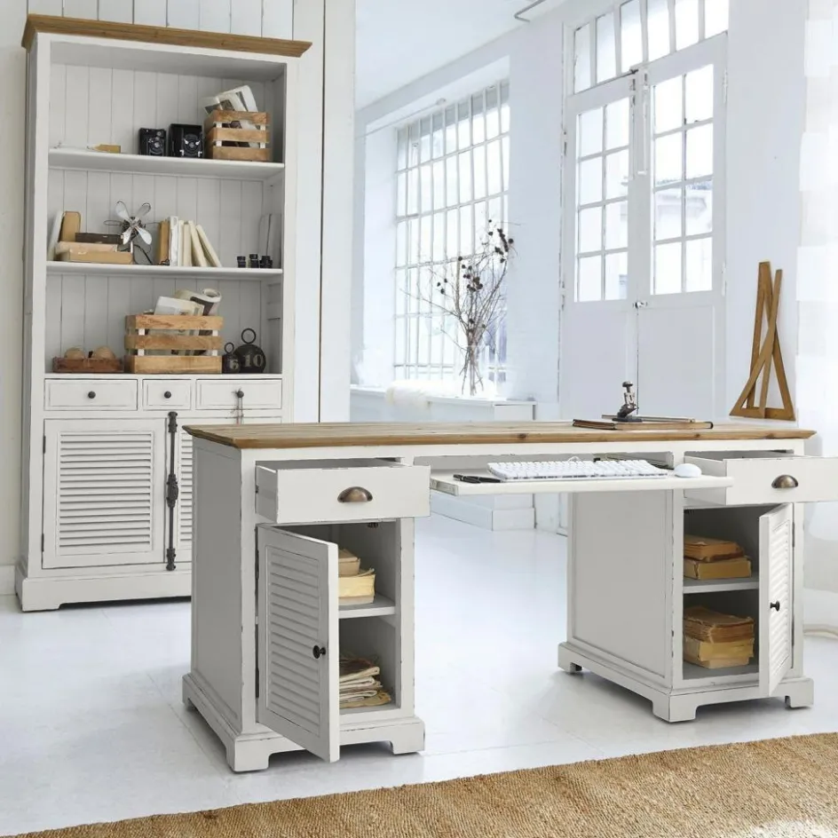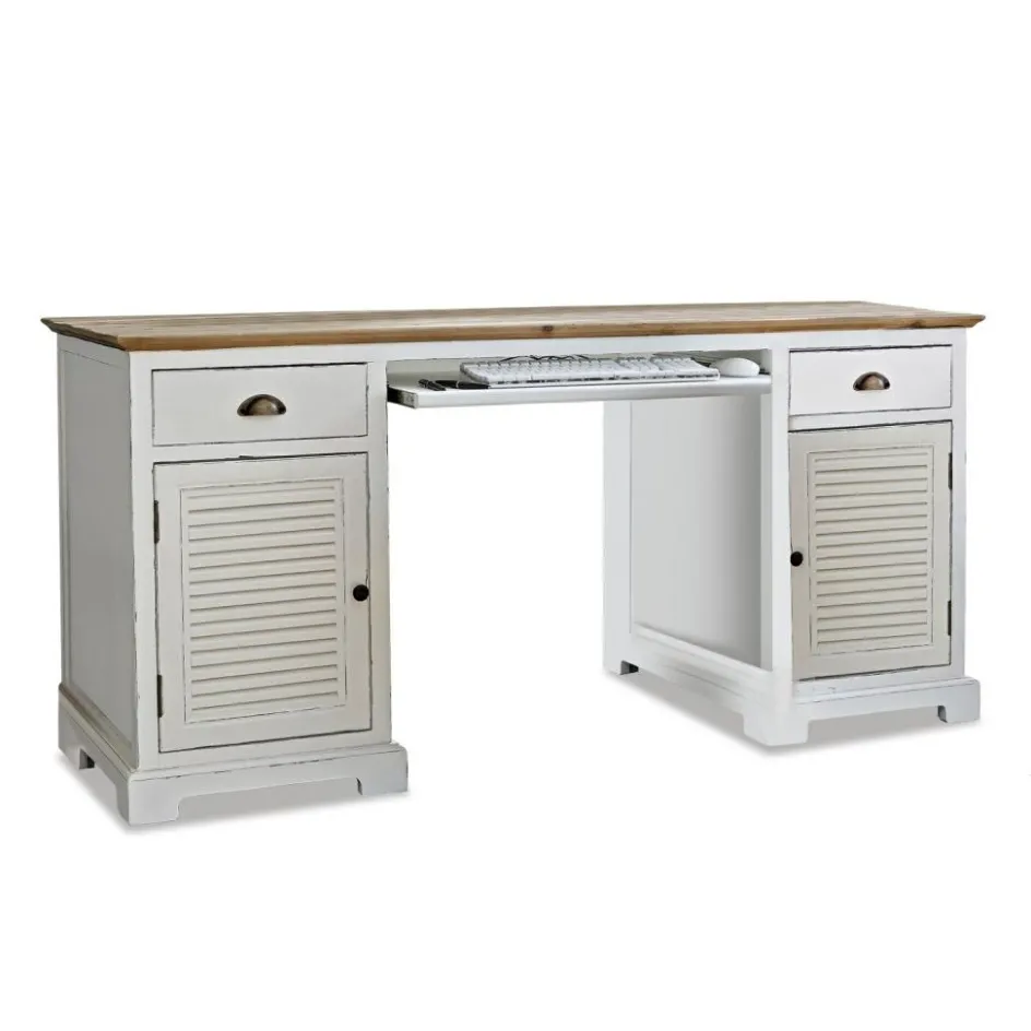 Die leichte und freundliche Optik dieses Schreibtisches wirkt so motivierend, dass einem die Arbeit gleich viel schneller von der Hand geht. Dominant sind die Seiten und Fronten aus Pappelholz, die dank des hellen Antik-Finishes für gute Laune sorgen. Die frische Farbgebung setzt auch die Lamellen der beiden Türen und die bezaubernden Füße des Tisches sehr hübsch in Szene. Gerade zum Landhaus-Stil passt diese Kombination hervorragend. Hinter den Türen verbergen sich geräumige Schrankfächer mit Einlegeböden. Die Schubladen darüber sind mit metallenen Griffen versehen. Sie passen sehr gut zu den kleinen Türknäufen. Der Schreibtisch wirkt so wohnlich, dass lediglich der Tastaturauszug an die Arbeit erinnert, die hier erledigt wird. Und so ist er nicht nur im Arbeitszimmer ein besonderes Schmuckstück, sondern ebenso im Wohnzimmer. Zu dem entspannten Eindruck trägt auch die Platte aus Tannenholz mit ihrem warmen Farbton bei, die für einen interessanten Kontrast sorgt.