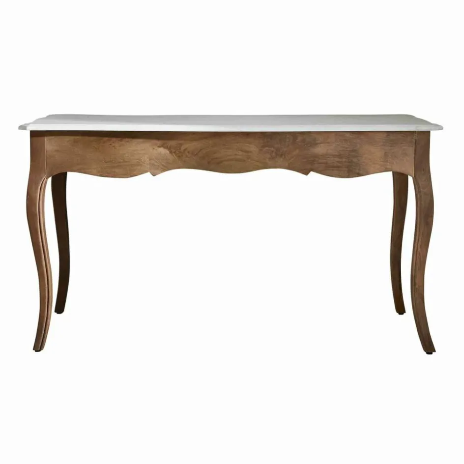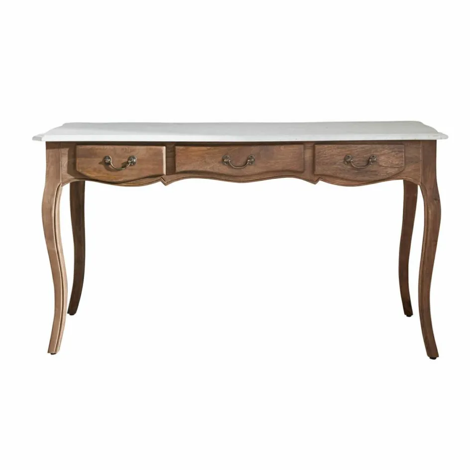 Mit diesem Schreibtisch zieht ein Möbelstück ein, das sowohl in seiner Funktion als auch in seiner Erscheinung beeindruckt. Die Oberfläche aus echter Marmorplatte wirkt nicht nur luxuriös, sondern bringt auch eine kühle, glatte Eleganz mit, die sich wundervoll mit dem warmen, natürlich gemaserten Mangoholz ergänzt. Die geschwungenen Beine greifen klassische Formen auf, erinnern an französische Landhäuser und lassen das Möbelstück fast tänzerisch wirken. Ob als Mittelpunkt eines stilvollen Homeoffices oder als Blickfang im Wohnraum – dieser Tisch verbindet Nutzwert mit Ausstrahlung. Die drei Schubladen mit dezenten Griffen bieten Raum für Ordnung, ohne dabei die Ästhetik zu stören.