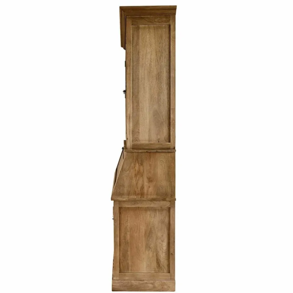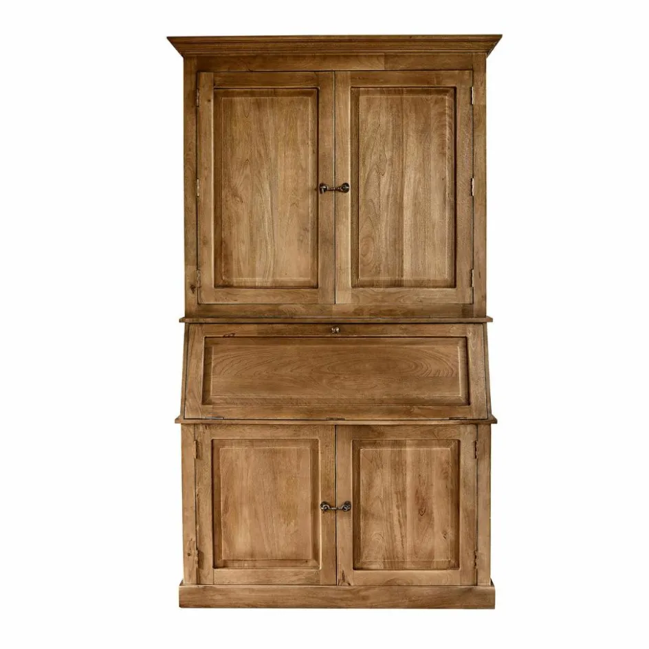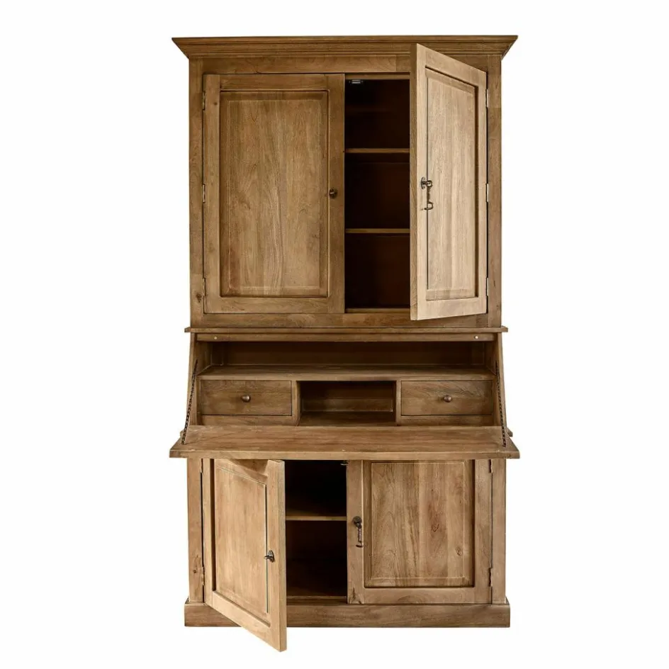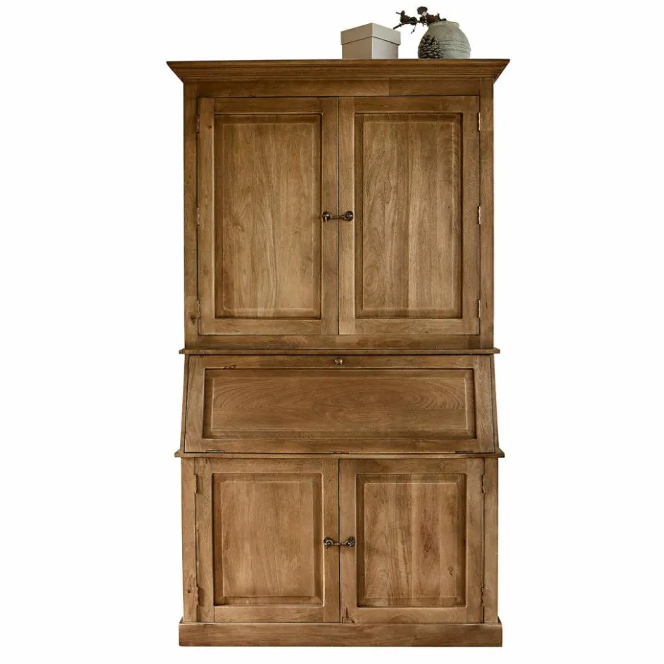 Ein schlicht imposanter Schrank im Landhausstil. Doch ihn nur Schrank zu nennen, wäre falsch. Er ist so viel mehr! Die aufklappbare Schreibfläche bietet Ihnen einen praktischen Arbeitsplatz, der bei Bedarf wieder diskret verschwindet. So stellen Sie ihn am besten in Ihr Arbeitszimmer. Gefertigt aus naturbelassenem Mangoholz, verbindet dieses Möbelstück die rustikale Schönheit der Natur mit höchster Handwerkskunst. Die sanft abgetönte Oberfläche fühlt sich angenehm an und betont die natürliche Maserung des Holzes. Die prachtvollen Kranzleisten setzen stilvolle Akzente und verleihen dem Sekretär eine majestätische Präsenz. Mit seinen zahlreichen Fächern und Ablagemöglichkeiten ist dieser Sekretär nicht nur ein funktionales, sondern auch ein dekoratives Highlight in Ihrem Zuhause.