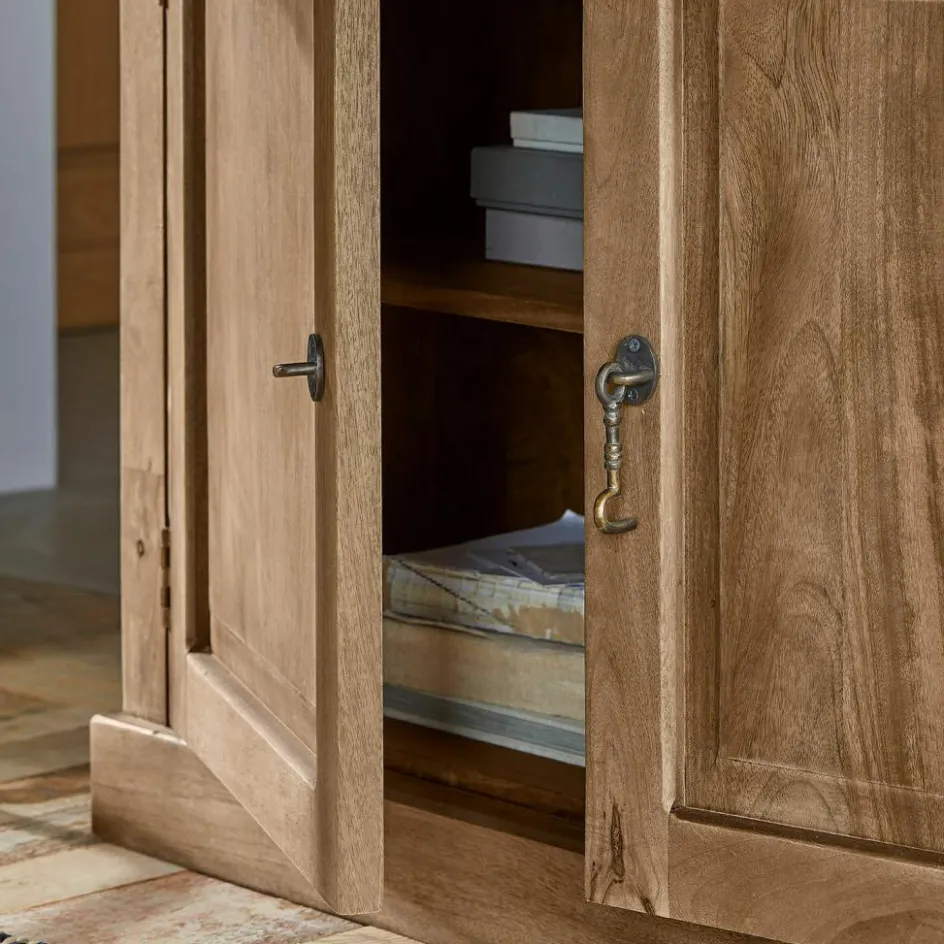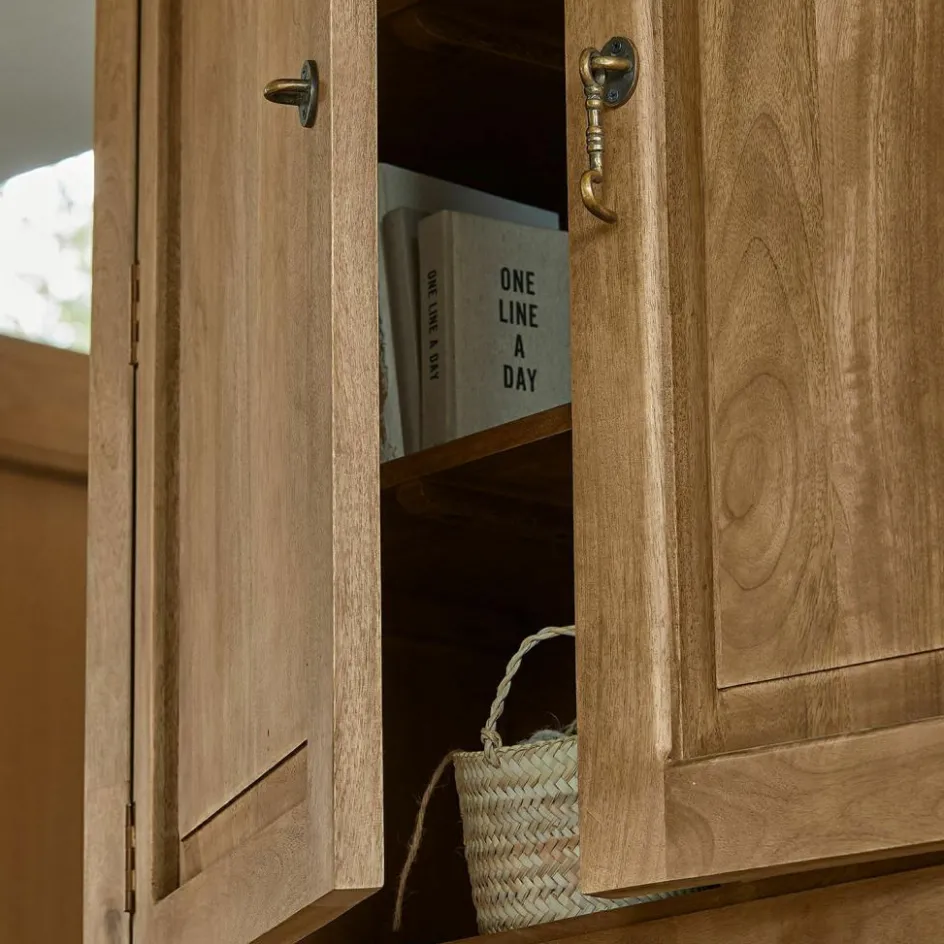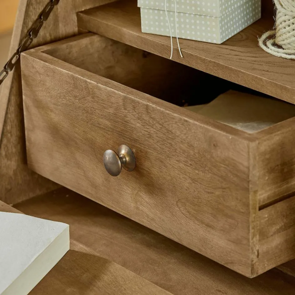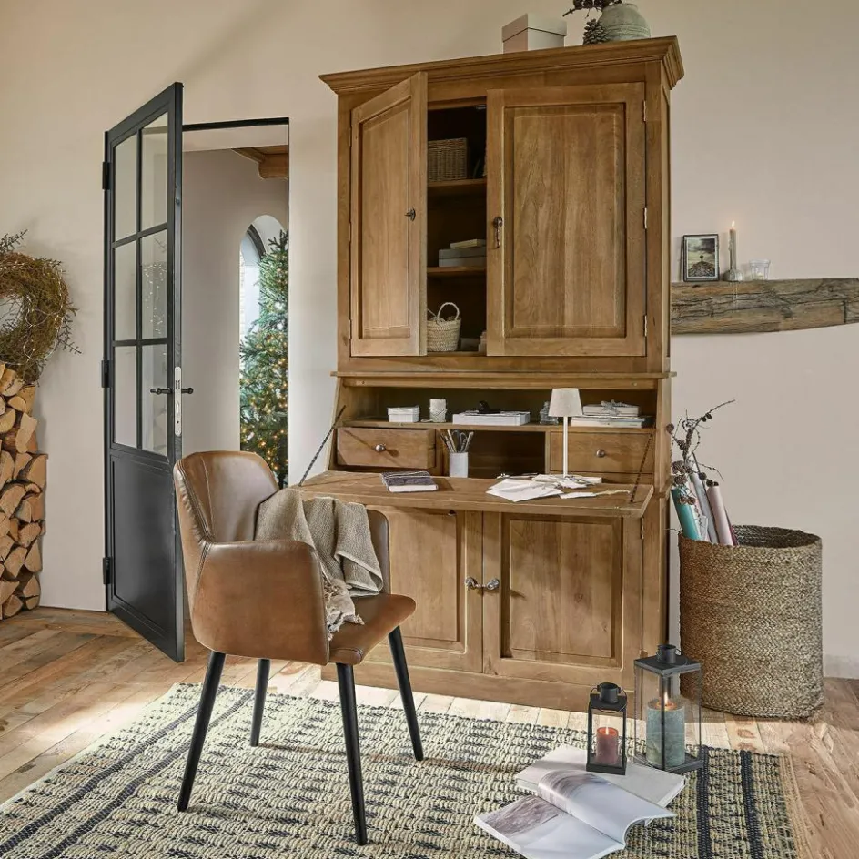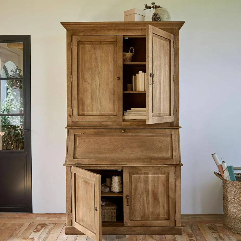 Ein schlicht imposanter Schrank im Landhausstil. Doch ihn nur Schrank zu nennen, wäre falsch. Er ist so viel mehr! Die aufklappbare Schreibfläche bietet Ihnen einen praktischen Arbeitsplatz, der bei Bedarf wieder diskret verschwindet. So stellen Sie ihn am besten in Ihr Arbeitszimmer. Gefertigt aus naturbelassenem Mangoholz, verbindet dieses Möbelstück die rustikale Schönheit der Natur mit höchster Handwerkskunst. Die sanft abgetönte Oberfläche fühlt sich angenehm an und betont die natürliche Maserung des Holzes. Die prachtvollen Kranzleisten setzen stilvolle Akzente und verleihen dem Sekretär eine majestätische Präsenz. Mit seinen zahlreichen Fächern und Ablagemöglichkeiten ist dieser Sekretär nicht nur ein funktionales, sondern auch ein dekoratives Highlight in Ihrem Zuhause.