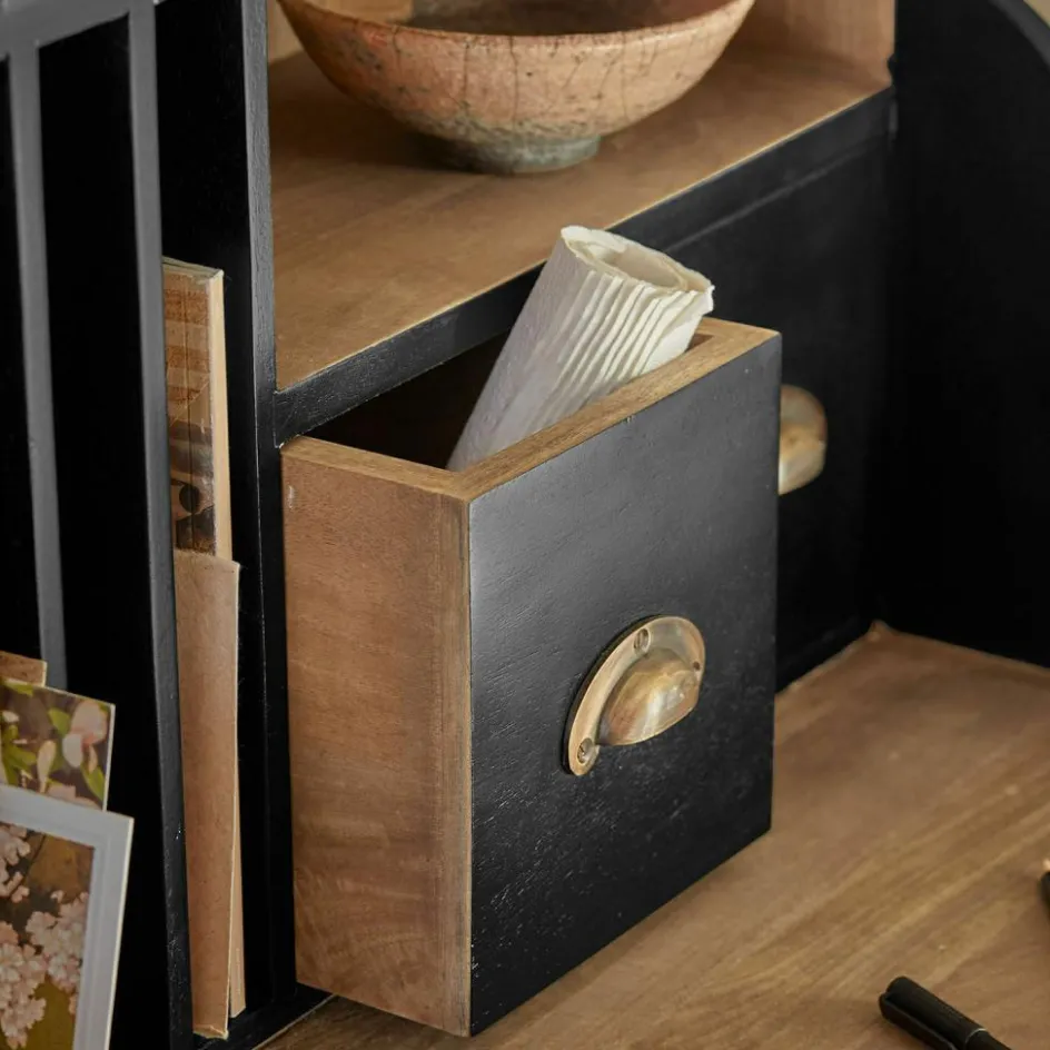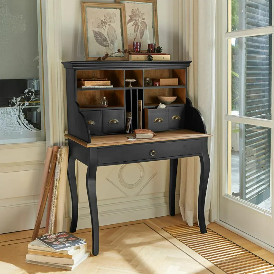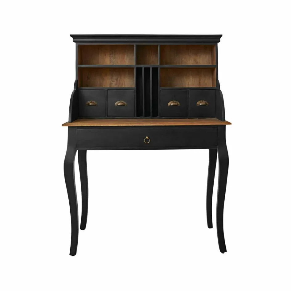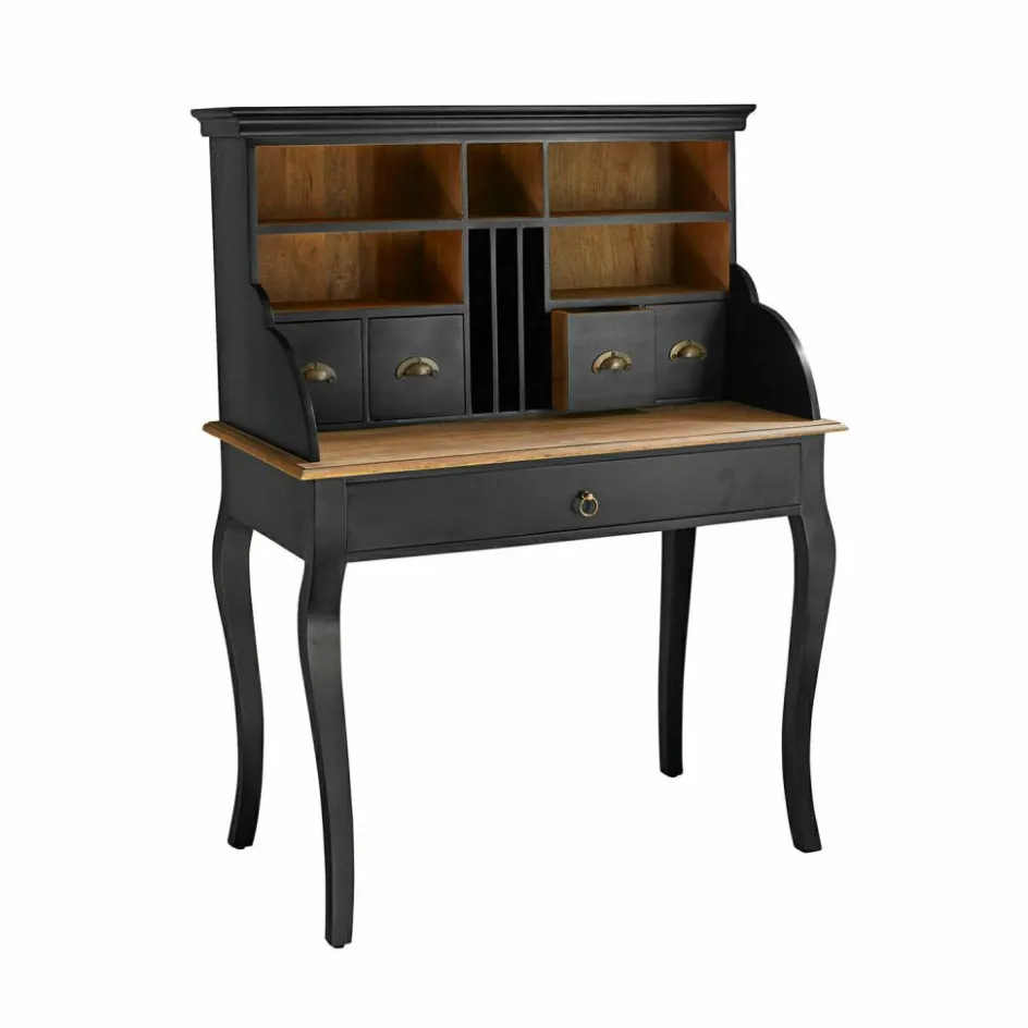 Der platzsparende Sekretär aus Mangoholz bietet jede Menge Stauraum für allerlei Schreibutensilien. Dafür sorgen die vier Schubladen mit Muschelgriffen sowie zahlreiche offene Fächer und eine große Schublade unter der Schreibplatte. Der antike Charme des Möbelstückes wird von den zierlichen Abmessungen, der ausgesprochen hochwertigen Verarbeitung und einer ganzen Reihe liebevoll ausgearbeiteter Details unterstützt: Die geschwungenen Beine, die abgerundeten Seitenteile und ein Reliefkranz verleihen dem Arbeitstisch einen klassisch-eleganten Look.