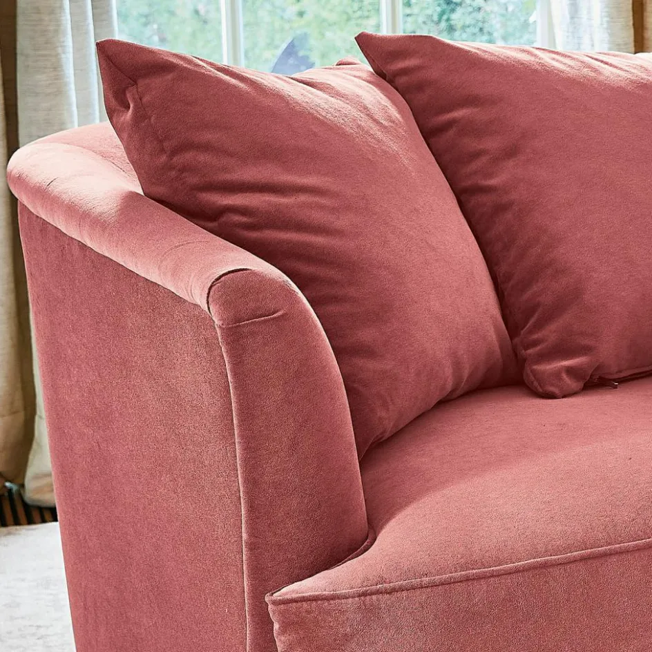 Träumen Sie von einem Sessel, in dem Sie sich rundum wohlfühlen und voll entspannen können? Mit seiner breiten Sitzfläche, samtig weichen Polstern und halbrundem Design bietet dieses edle Schmuckstück den perfekten Platz zum Einigeln mit einem guten Buch. Er ist etwas breiter als ein normaler Sessel und erfüllt daher alle Eigenschaften eines gemütlichen Lounge-Chars, in dem sie auch mal eng zu zweit kuscheln können. Die Füße aus Holz verleihen ihm einen besonders stilvollen Touch. Aber natürlich ist der schicke Sessel nicht nur ein Blickfang, sondern auch äußerst bequem. Mit zwei Zierkissen versehen, die zur gemütlichen Rückenstütze bereit liegen, ist der breite Sessel ideal für entspannte Fernsehabende oder gemütliche Treffen mit Freunden. Der Bezug sorgt natürlich ebenfalls für optimalen Komfort: Er ist weich wie Samt und schimmert auch, je nach Lichteinfall und Blickwinkel, in leicht unterschiedlich glänzenden Farbtönen. Noch ein Plus für diesen bequemen Sessel.