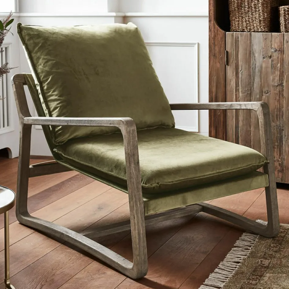 Ist der Landhaus-Stil nicht faszinierend facettenreich? Von barocker Prachtentfaltung über ländlichen Charme bis zu skandinavisch reduziertem Design reicht die Bandbreite und bei allen individuellen Unterschieden vermitteln die Möbel doch immer das Gefühl anheimelnder Wohnlichkeit. Wenn Ihr Herz für das ambitionierte Design des hohen Nordens schlägt, werden Sie mit diesem Sessel Ihren neuen Lieblings-Entspannungsplatz gefunden haben. Denn er ist ein exquisites Beispiel dafür, wie elegant eine minimalistische Linienführung wirken kann, während der Sessel zugleich mit einem Höchstmaß an Komfort verwöhnt. Wie werden Sie es genießen, sich am Abend nach einem anstrengenden Tag in diesen Sessel fallen zu lassen, die luxuriöse Weichheit der Kissen zu spüren, während Ihre Arme auf den sanft gerundeten Armlehnen ruhen! Natürlich dürfen Sie in dieser Situation die Augen schließen, Sie sollten aber später nicht versäumen, den Blick über diese zeitlos schöne Möbel-Kreation schweifen zu lassen, die Ihrem Wohnambiente eine ganz eigene Ausstrahlung verleiht. Wie es typisch für skandinavisch inspirierte Möbel ist, demonstriert auch dieser Sessel seine Naturverbundenheit durch die Vorliebe für Naturmaterialien. Das stabile Gestell wurde aus hochwertigem Eichenholz gefertigt, das für seine Robustheit und lange Lebensdauer bekannt ist und hier sogar mit einem Gewicht bis zu 150 kg belastet werden kann. Als Bezugsstoff für die Kissen wurde Samt gewählt, was sich zu jeder Jahreszeit angenehm auf der Haut anfühlt.